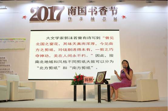 8月11日“羊城少年学堂”第121讲“走进剪纸的世界”在南国书香节主舞台——广交会展馆B区13.2号馆主题沙龙馆上举行。在整个书香节5天活动中,仅有21场有份量的活动在主题沙龙馆举行,本场羊城少年学堂活动就是其中之一,正高级剪纸工艺师、儿童美术教育家、中国工艺百杰韩艳,为书香节读者们带来题为“走进剪纸的世界”的专题讲座。据悉,“羊城少年学堂”是由广州市社会科学界联合会、广州市教育局、广州市文化广电新闻出版局主办,广州少年儿童图书馆承办的青少年人文社科普及平台,从2015年9月启动至今已推出形式丰富的社科普及活动120多讲。这是“羊城少年学堂”第2次走进南国书香节,第一次被纳入主题沙龙馆活动中。