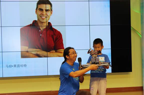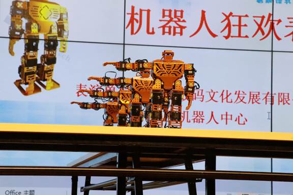 温情的朗诵后是机器人展示环节,巴巴机器人活动中心带来了激情洋溢的智能机器人舞蹈和人机对话互动,机器人个子虽小但本事不小,不仅能前、后滚翻,还能跳舞,《千手观音》和《青春修炼手册》都能轻松演绎,让小读者近距离地体验到科技的神奇,让孩子们着迷不已。