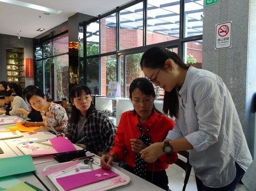 在课程开始之前,由“越图之声”为在座的每一位读者朗诵有关节日主题的诗词,抑扬顿挫,充满感染力。再现当时诗人对节日的有感而发。呈现了中国作为“诗”的国度的诗意情怀和源远流长、内涵丰富的传统民俗文化。在读书声的余音袅袅中,“阅创工坊”敬亲花卉制作课程也开始了。看着课桌上一张张五颜六色的教材心情也豁然开朗起来了,在桂花飘香,菊华静美的金色秋天,用自己的一双巧手,制作一朵永不凋零的花,献给长者和前辈,可谓饱含祝福和深情。在座的每一位读者都专心致志地听讲,构想着自己心中的花朵。