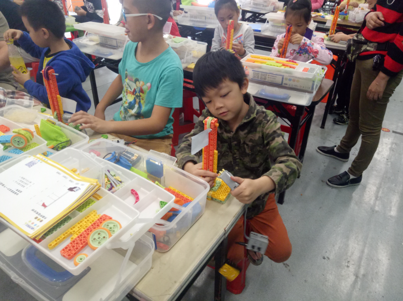 接下来轮到小朋友在老师一步步的指导下,动手拼一支属于自己的升旗杆。构创意,找零件,小朋友们忙的不亦乐乎。最后装上马达,一组自动升旗杆便大功告成了。