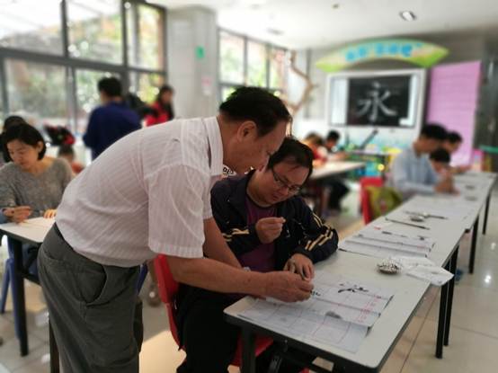 活动开始,越秀区图书馆馆员就引用网上那段精彩的演讲做开场白,听后让大家说说自己感想,一位小读者说:“要学好中国字,要传承中国文化!”现场一片掌声。于是,图书馆员很自然地就请出中国书法美术家协会理事长——邵喜柱老师为大家普及汉字书法的有关基础知识。老师深入浅出地以“永”字为例,介绍了书法中的8大笔画。随后参加活动的读者们都用心的练习,老师一个一个的分别指点,大家都受益匪浅。一位年轻的妈妈感慨地说:“我记得对上一次拿毛笔还是我小学三、四年级的时候,现在连一个字都写不好了。”另一位妈妈很温婉地手握3岁孩童的手,一笔一划的教孩子写,还不时的鼓励孩子,瞧!3岁孩子都能写出“永”字!