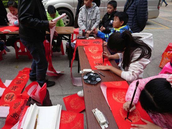 12月24日10点,由白云区图书馆和奇卡教育集团联手主办的“喜迎元旦,辞旧迎新”迎元旦活动在文化中心大院B2栋楼下空地举行。活动设置了手工制作、毛笔书写春联和猜灯谜三个项目,并免费提供纸墨和手工制作材料,结束后还可以把亲手写的春联和手工作品带回家。活动现场被参加活动的读者围得严严实实。