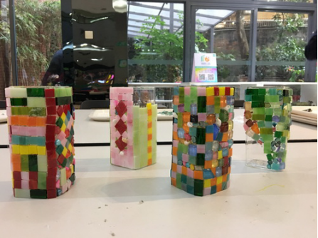 马赛克,分为陶瓷锦砖和玻璃锦砖两种。是一种装饰艺术,由于马赛克其单颗的单位面积小,色彩种类繁多,具有无穷的组合方式,能将设计师的造型和设计的灵感表现得淋漓尽致,尽情展现出其独特的艺术魅力和个性气质。这次课程,老师让读者们通过镶嵌的艺术,利用一颗颗闪亮的马赛克瓷片、一粒粒五颜六色的珠子、一个个洁白精细的小贝壳……为这些平凡的蜡烛杯来个美丽大变身。在制作的课程中,难免会有些小问题,这时候我们极具亲和力的老师就会将自己“乾坤大挪移”到你身旁,细心地倾听,耐心地指导,力求每一位读者都能创作出一个自己最满意的作品。