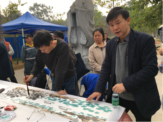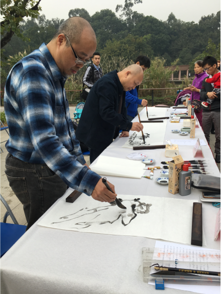 1月3日上午天河区图书馆在华南农业大学湿地公园开展第七届廉洁读书月系列活动书画作品现场挥毫。活动邀请到广州市山水画会副会长、市美协山水画艺委会秘书长陈开宇,广州十大平面设计师、广州美院客座教授黄汝鸿,广州美院山水工作室画家、广东省美协会员古宝添,天河书画院院长、天河区美协副主席万测宇四位书画家亲临现场。