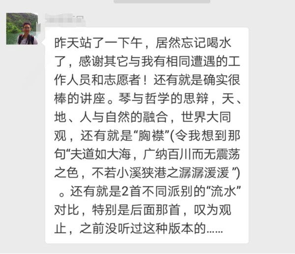 2、玉莲:……徐元白等志士弃官重振浙派,我们都应该为传统文化的传承献出自己的薄力。讲座至少能让部分人对古琴感兴趣,有这份传承传统文化的心。后面观众舍不得离场,还请王光磊老师演奏精彩的《秋鸿》。还有观众希望古琴能推向教学,普及到学校。