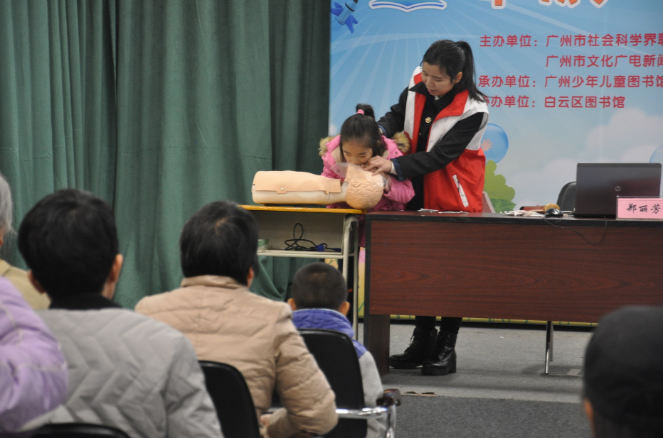 1月27日下午,由广州市社会科学界联合会、广州市教育局、广州市文化广电新闻出版局主办,广州少年儿童图书馆承办,白云区图书馆协办的羊城少年学堂白云区图书馆第15讲准时与读者朋友见面,这一次请到曾任广州市第一人民医院护士、国家执业护士、现任广州市健安应急救护培训中心专职老师的郑丽芳老师主讲“一起来学五大急救术”,吸引了大批读者参加,通过互动提问和模拟练习,大家学到很多实用的急救知识。