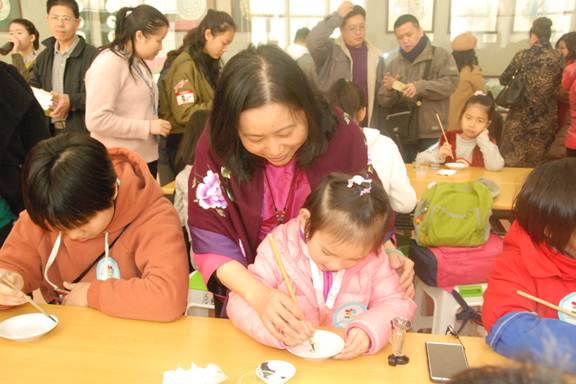 广州少年儿童图书馆对特殊孩子进行非遗文化弘扬和传承,也是不遗余力的。展览开幕仪式结束后,来自广州市启聪学校的听障学生和父母兴致勃勃地参观了广彩作品展,近距离感受“广彩”这项国家级非物质文化遗产的工艺之美。广彩市级代表性传承人赵艺明老师、广东省陶艺大师冯瑞华老师为听障学生们讲解广彩基础知识,并手把手地教导孩子们描绘充满年味的广彩瓷盘,让听障学生们感受广彩非遗文化魅力。