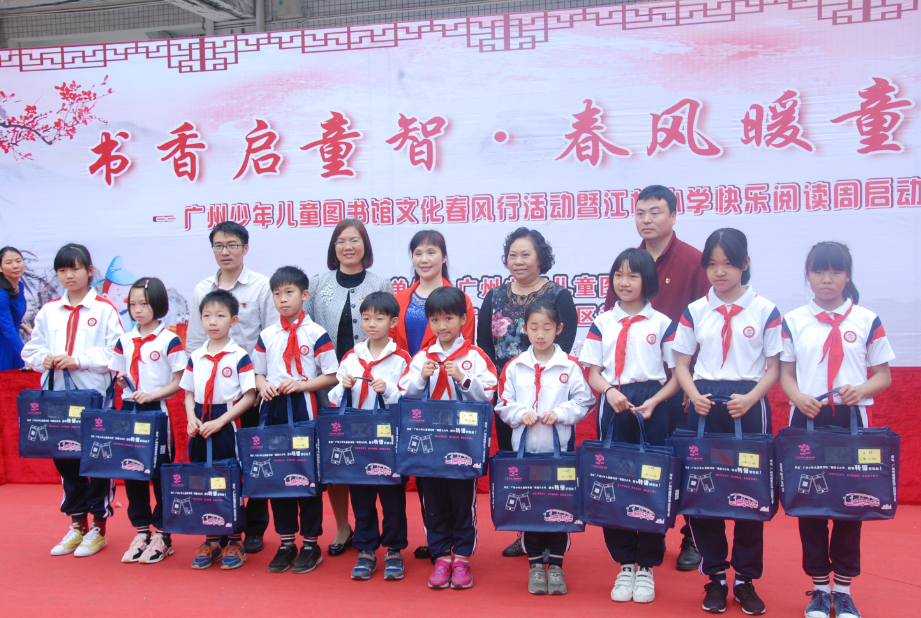 为了贯彻落实十九大会议精神,弘扬社会主义核心价值观和中华优秀传统文化,开展文化帮扶,关爱城郊儿童、来穗务工人员子弟、特殊儿童等弱势群体,送书、送文化下乡,缩小城乡文化差距,坚定文化自信,推动社会主义文化繁荣兴盛,丰富广州地区百万青少年儿童的阅读生活,进一步宣传图书馆的惠民服务,2018年3月6日上午,广州少年儿童图书馆在广州市白云区江村小学开展“书香启童智 春风暖童心——广州少年儿童图书馆文化春风行活动暨江村小学快乐阅读周”启动仪式,白云区江村小学1000多名师生参加了本次活动。江村小学谭燕香校长感谢广州少年儿童图书馆一直以来对该校的文化帮扶、送书到校服务,梁宝球副校长对全校师生发起了“快乐阅读周”倡议。广州少年儿童图书馆吴翠红副馆长向江村小学赠送了一批优秀中文少儿科普图书,向在该校就读的特殊儿童和优秀来穗务工人员子弟分别赠送了广州少年儿童图书馆精心设计的文创产品和《漫话广州》套装漫画书,为全校学生派发了广州少年儿童图书馆“图书转借好轻松”宣传环保袋。当日,广州少年儿童图书馆工作人员还为全校学生提供了图书借阅服务,并有针对性地为该校特殊儿童开展了知识游戏。3月份,广州少年儿童汽车图书馆将陆续把精心挑选的热门中文读物赠送给多所城郊学校。