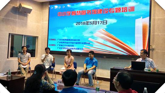 培训的第二环节是校园智慧图书馆建设案例分享交流。广州市黄埔职业技术学校图书馆陈明华馆长、广州市白云中学图书馆沈丽华馆长、广州大学附属中学图书馆吴雁程老师和广州市铁一中学番禺校区图书馆李高权馆长共同分享了各自在进行智慧化图书馆建设过程中的经验和需要注意的事项。接着,主持人广东实验中学图书馆李杨栈馆长和参会嘉宾共同探讨中小学智慧图书馆的发展未来。他们一致认为科技引领创新,中小学图书馆进行智慧化建设可以为师生借阅、图书馆的服务锦上添花,因此,各馆应因地制宜、以科学高效双赢为原则,争取本馆智慧化图书馆建设利益最大化。同时,他们也认为:智慧图书馆不单是技术的智能,还要加上馆员和读者的智慧,只有这样才能最终实现图书馆的智慧化建设。