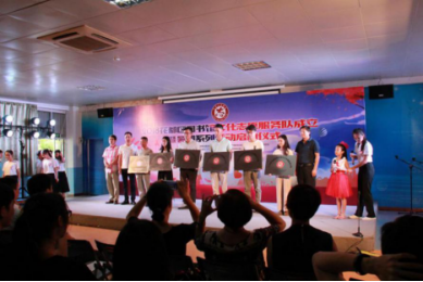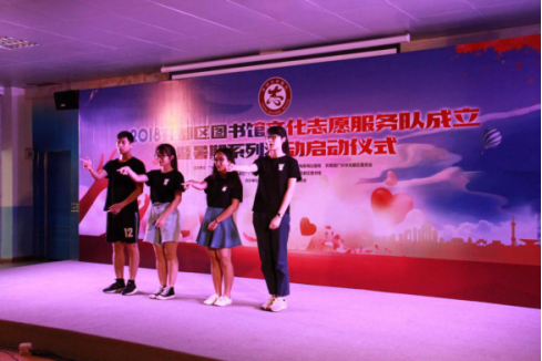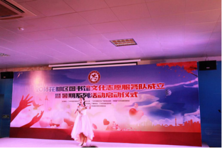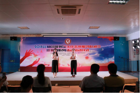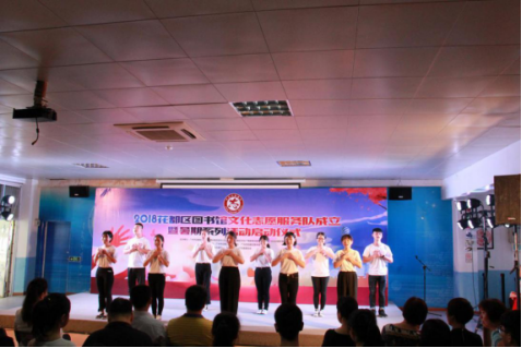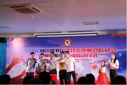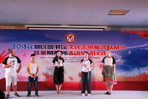 活动中花都区委宣传部副部长、区文明办主任胡才波向花都区图书馆授予文化志愿服务队牌匾,花都区文广新局社文科科长何圣、花都区青年志愿者协会秘书长周运芽等向广东第二师范学院、华南理工广州学院、广东行政学院、广东交通学院等高校志愿服务分队、东风日产志愿服务分队及社会志愿服务分队授牌,文化志愿服务队的成立预示着花都区图书馆志愿服务工作跃上新台阶。