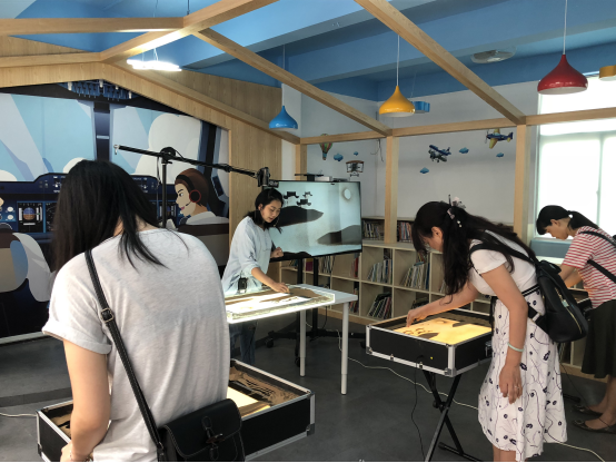 田源老师根据一边示范,一边个别指导, 学员们在模仿老师的作品的同时学习和练习沙画的手法,山峰、塔、小鸟、云朵、拱桥呼之欲出,学员们还加入了自己的想象和创意,根据掌握的元素,创作出各不相同的沙画。