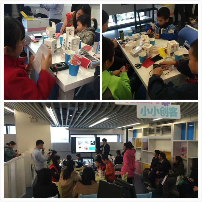 紧接着1月15日下午,阅创空间又举办了“创意纸杯工坊”活动,主讲人首先介绍了简单的电路知识,二极管的正负极、万用电表测电压,如何用电表判断物品是否导电等等,为孩子们打开了“电”的世界。在介绍完基本知识后,动手时间开始了,孩子们用双面胶、剪刀、海绵纸、纸杯等简单用品自己设计、创作纸杯台灯。在制作的过程中,孩子们遇到了一些困难,比如:如何控制电灯的开关,二极管容易接触不良怎么办等等。在主讲人的循循善诱下,孩子们自己思考,动手尝试,独立找到了各种解决方法。各式各样生动有趣的纸杯台灯完成了,有小鸟、叮当猫、外星人等等形象。制作完成后,主讲请孩子们逐一上台展示自己的作品,分享自己的设计灵感。小朋友的设计不管是从外形还是开关设计都让人脑洞大开,现场的成人都有一种智商被碾压的感觉,纷纷手动点赞。