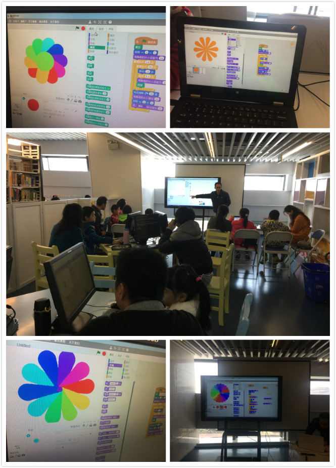 1月22日上午,魔法图书馆服务团队在广图开展了“创意儿童编程IX”的活动,10位9-10岁的小朋友参与了本次学习。老师向小朋友介绍了怎样利用简单易懂的素材进行编程绘图。在老师的循序渐进指导下,小朋友开始学习绘制简单的圆形,鼠标简单操作调出几个命令程序后,圆形居然会缩放、跳动,“图章”工具让圆形变成了小花瓣,“旋转15度”“重复N次操作”后电脑屏幕上竟开出了一朵朵风格迥异的灿烂小花。有些小朋友运用自己的聪明才智,在老师讲授的基础上还进行了深度创作。下课后,大家还意犹未尽,仍保有继续创作的热情。