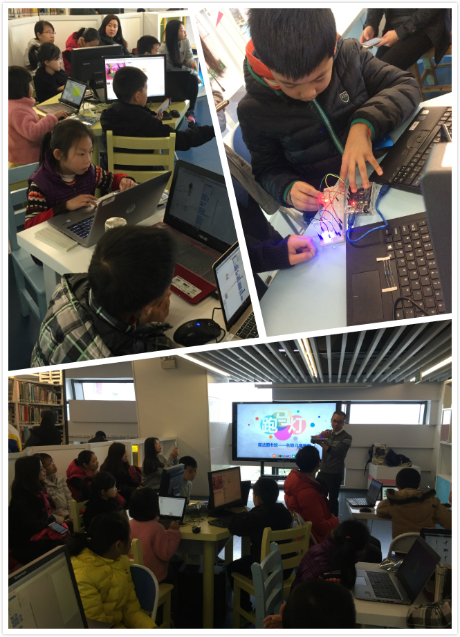 2月26日上午,魔法图书馆广图服务队的老师给小朋友们带来了创意编程小课堂——“跑马灯”。小朋友们跟随老师运用Scrach软件进行设计编程,控制LED灯的一开一关,一盏跑马灯就完成了。有一组小朋友还设计了五盏跑马灯的效果,特别有成就感。