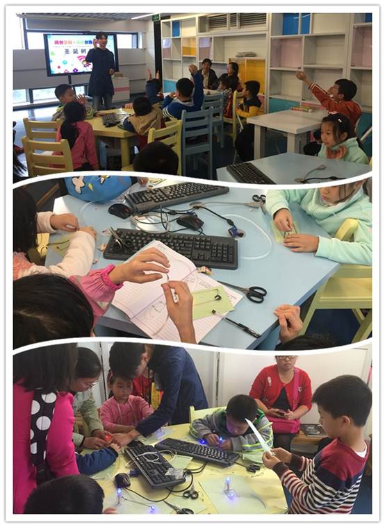 紧接着3月12日下午,创新林创客空间的老师为小朋友们带来了圣诞树工作坊。小朋友使用简单的材料——一个LED灯管和一个纽扣电池,制作出一个简易电路,并以此点亮自己的圣诞树。