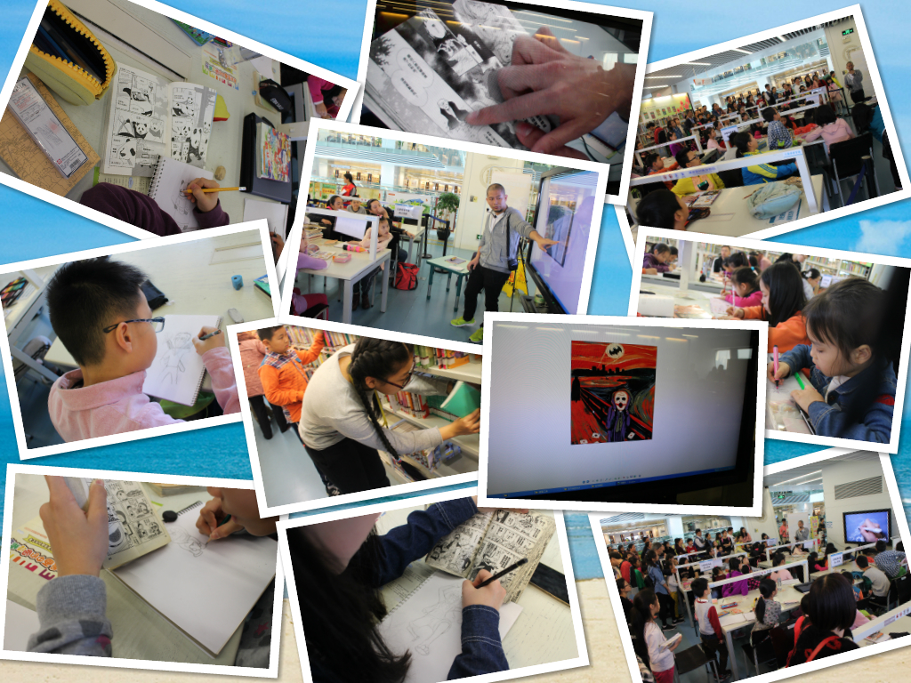 最后,邓老师还为读者们分享了短片《神奇飞书》。它通过色彩的变化来描绘了图书管理员的一生。短片观赏过后读者互动更加热烈,不少家长纷纷踊跃提问,应该如何进一步把动漫的精华提出,帮助孩子感受动漫魅力的同时学习到健康的知识。 讲座落下帷幕之后,许多读者都迫不及待要报名参加次日邓老师的动漫培训课程,等待着4月4日别开生面的漫画欣赏活动。 4月4日,同样是邓老师主讲的漫画培训课。这一次的培训课是3日讲座的延伸,在3日介绍设计原理的基础上,他决定亲自手把手的教导小读者如何临摹和设定一个漫画角色。