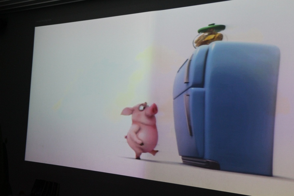 作者给小读者播放小动画视频,动物角色夸张的动作,简洁、到位、容易理解的故事情节,向小读者展示了故事创作重要的元素:不需要语言解释,好玩,生动的画面,给孩子们留下了深刻的印象。在一片欢笑之中,作者不忘给孩子们讲解写故事的