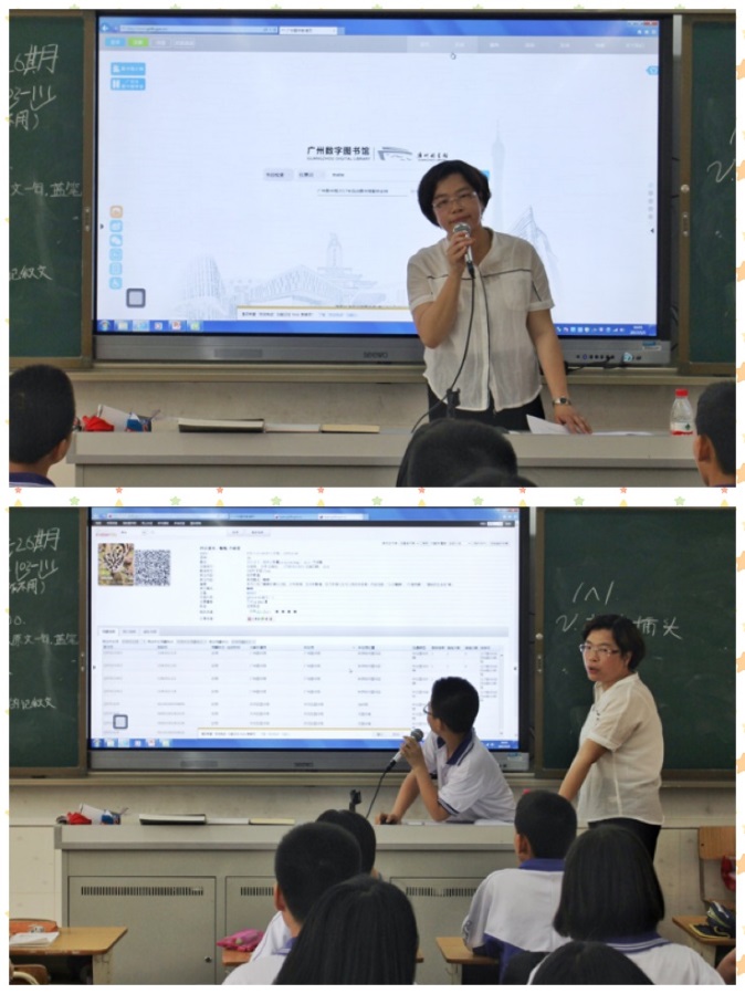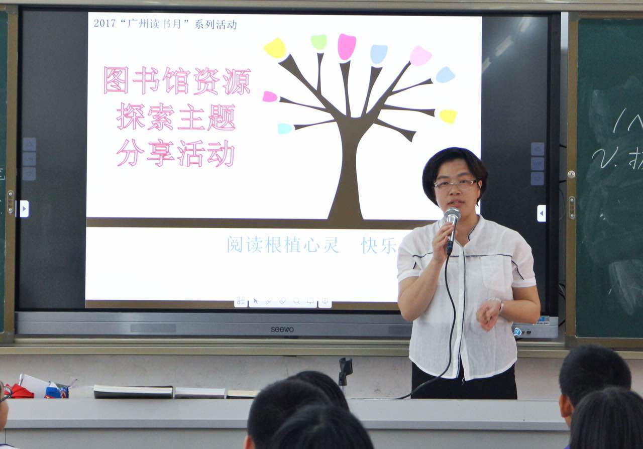 方老师还向师生们介绍广州图书馆主办的阅读推广活动:比如品牌活动:【阅创空间】青少年艺术坊、科普小达人、小创客等子系列活动;方老师还重点介绍2017年首次推出的“悦读童行”-----广州图书馆儿童与青少年阅读攀登计划,向同学们展示了充满缤纷色彩的阅读包….