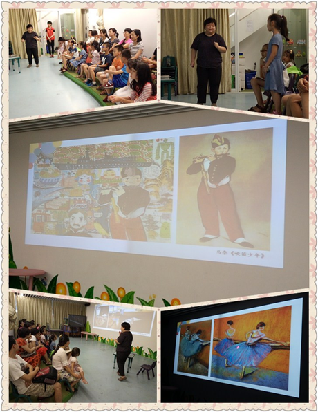 活动中,孩子们参与了竞猜名画的游戏。图片展示后,孩子们都纷纷竞猜起来,真的很厉害,大部分的名画都给孩子们猜出来了,这说明孩子们平时有去了解和收集名画的知识。英国著名儿童艺术读物编著者路西.密克维特曾说过:“把艺术映入孩子眼中,能够帮助他们认识周加世界,了解和他们共享这个世界的人们。”这就是让好孩子多欣赏世界名画最主要的原因,或许孩子现在还看不懂,但请相信,多年后,不论他走到世界的哪个角落,这些他曾欣赏过的画作都会让他不由自主的停下脚步,触动内心那个最甜蜜的亲子共赏时光!