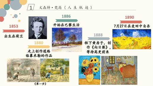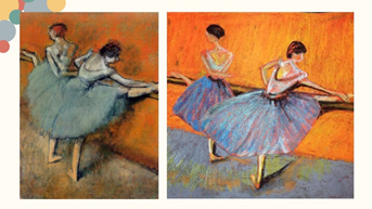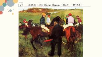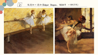 活动第二环节是了解两位画家文森特·梵高和埃德加·德加。梵高是荷兰后印象主义代表画家,也是西方历史上最著名的画家之一。他的作品对西方20世纪表现主义绘画有深刻的影响。梵高一生贫困潦倒,经常需要弟弟的接济过活。他绘画了将近九百幅油画,上千幅素描和近千封书信。在欣赏梵高作品时,孩子们会发现梵高绘画的《阿尔勒的卧室》,这幅画最不同寻常的是它独特的透视,强烈的色彩打破了僵直的透视线。去了巴黎生活的梵高,绘画也发生了转变,原来是受到日本浮世绘的影响。浮世绘给人愉快的印象,无形中拯救了身陷贫困与不幸的梵高,他采用比以前明亮的色彩和平面的形式,便是受到浮世绘的影响。孩子们看到梵高的向日葵,纷纷说每朵花就像一团火,细碎的花瓣和葵叶则像火苗,整幅画就像是烧遍画布的熊熊火焰。梵高有着火一般炽热的感情和强烈的艺术气质,他个性鲜明,特别喜欢明亮的阳光,喜欢黄色的向日葵。