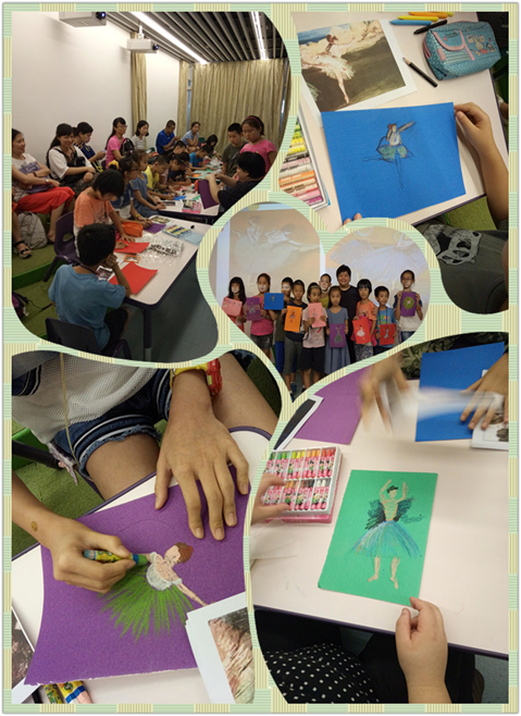 经历了赏读、竞猜名画之后,到了有趣模枋大师绘画环节,严老师建议学画德加的《芭蕾舞者》。绘画工具材料:油画棒和彩色砂纸。老师告诉小读者,先用油画棒轻轻地用线条勾画出舞者动作的轮廓,再按原画颜色涂上颜色。在涂颜色时,用力有轻重的变化,会使画面颜色出现浓淡变化,产生立体感和空间感。