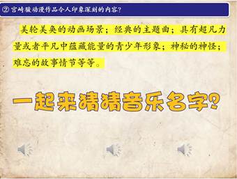 宫崎骏作品中美轮美奂的动画场景;经典的主题曲;具有超凡力量或者平凡中蕴藏能量的青少年形象;神秘的神怪;难忘的故事情节等都令人印象深刻。方老师首先,通过互动游戏,带领学生与宫崎骏作品来一次美丽的邂逅。对宫崎骏作品留下第一次直观的印象。
