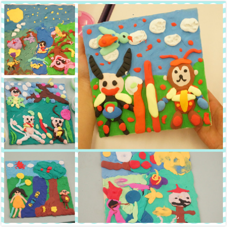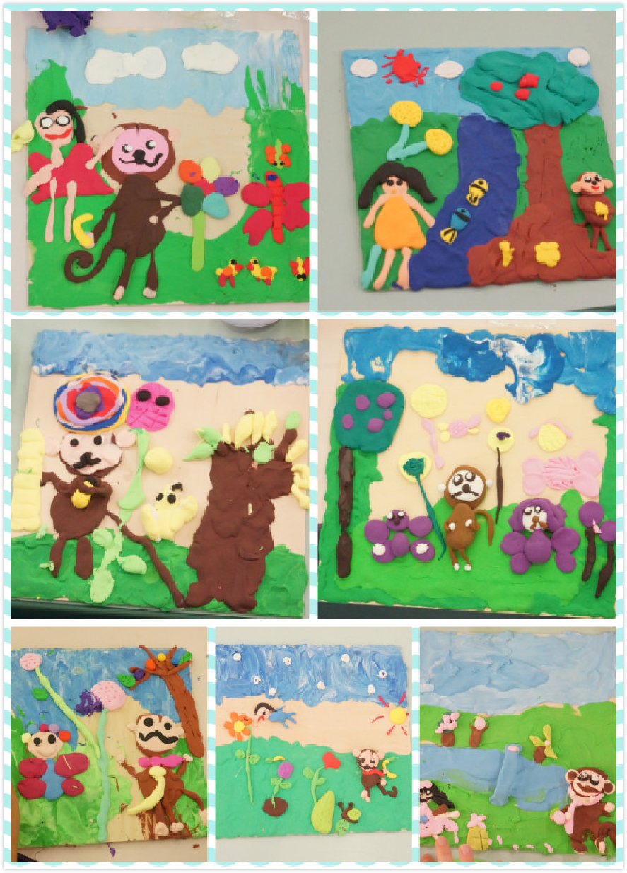有孙悟空和牛魔王相遇的情景,有夜空下小猴子摘香蕉的画面,还有小猴兄妹的野外故事等等,各有各的特色,小朋友们在用色上也是十分讲究,从画面的颜色搭配看整体来说还是非常鲜亮、协调,故事情节比较生动,部分孩子画面上主次体之间也非常清晰,连上两次课的小朋友对于一些揉、捏的基本技巧把握的更为熟练了,在思维空间认识上会渐渐注意全局观了,而部分初学的小朋友虽然基本技巧没有那么熟练,但在表达上却是十分自由生动,也希望小朋友可以坚持学习,创造出更好的作品。
