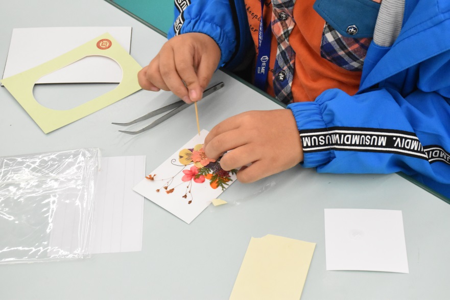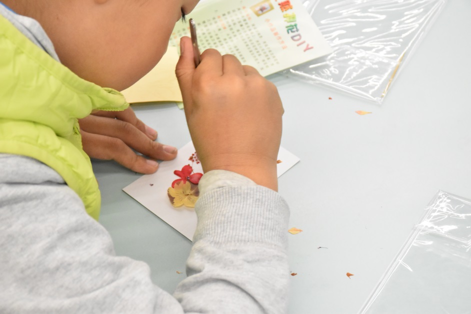 李老师简单介绍押花的定义和内容, 押花的古代历史渊源和现代的发展史,观看PPT各种风格和不同时期押花画的获奖作品,讲解押花制作的基本步骤之后,在老师指导下动手学习制作押花小摆件。