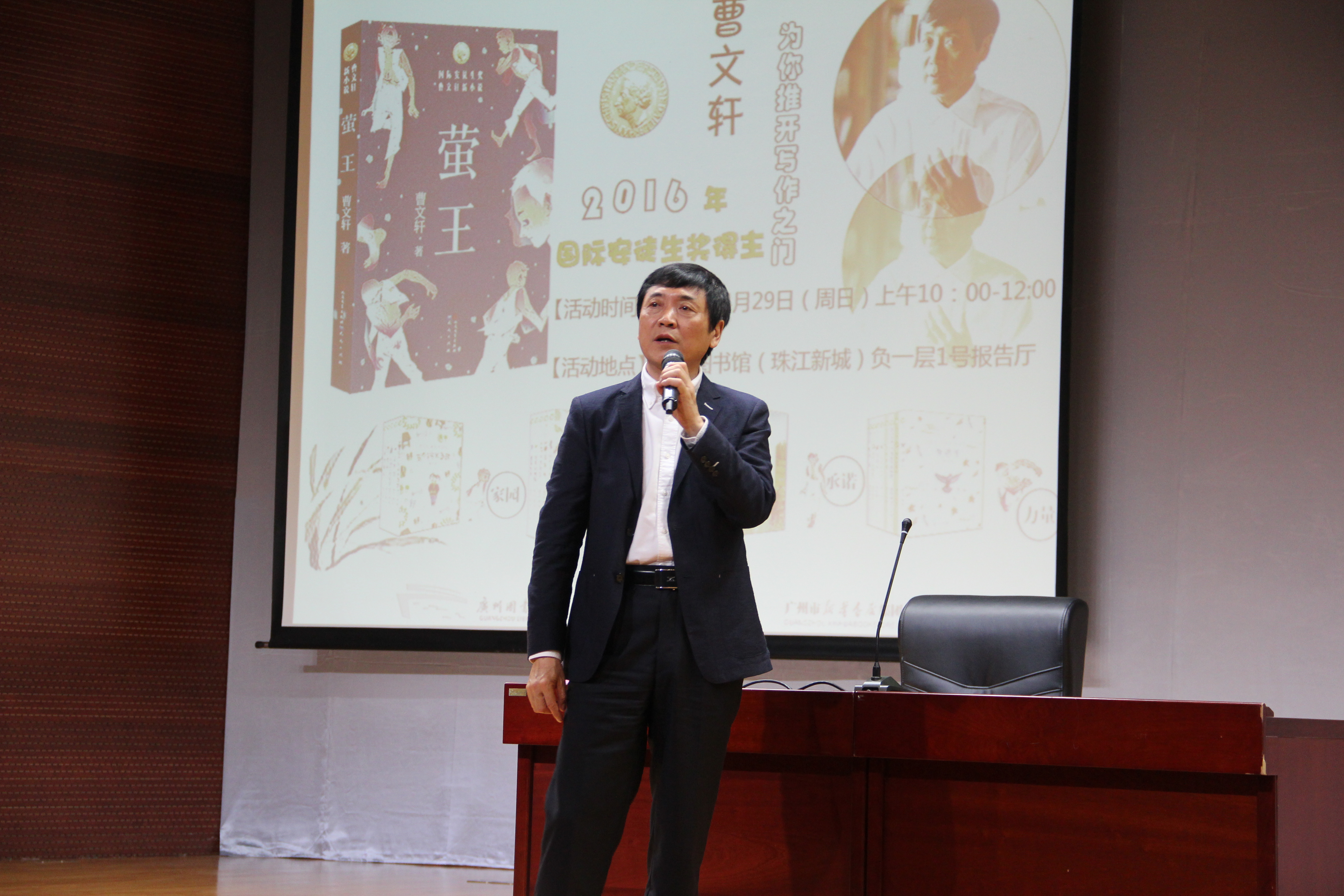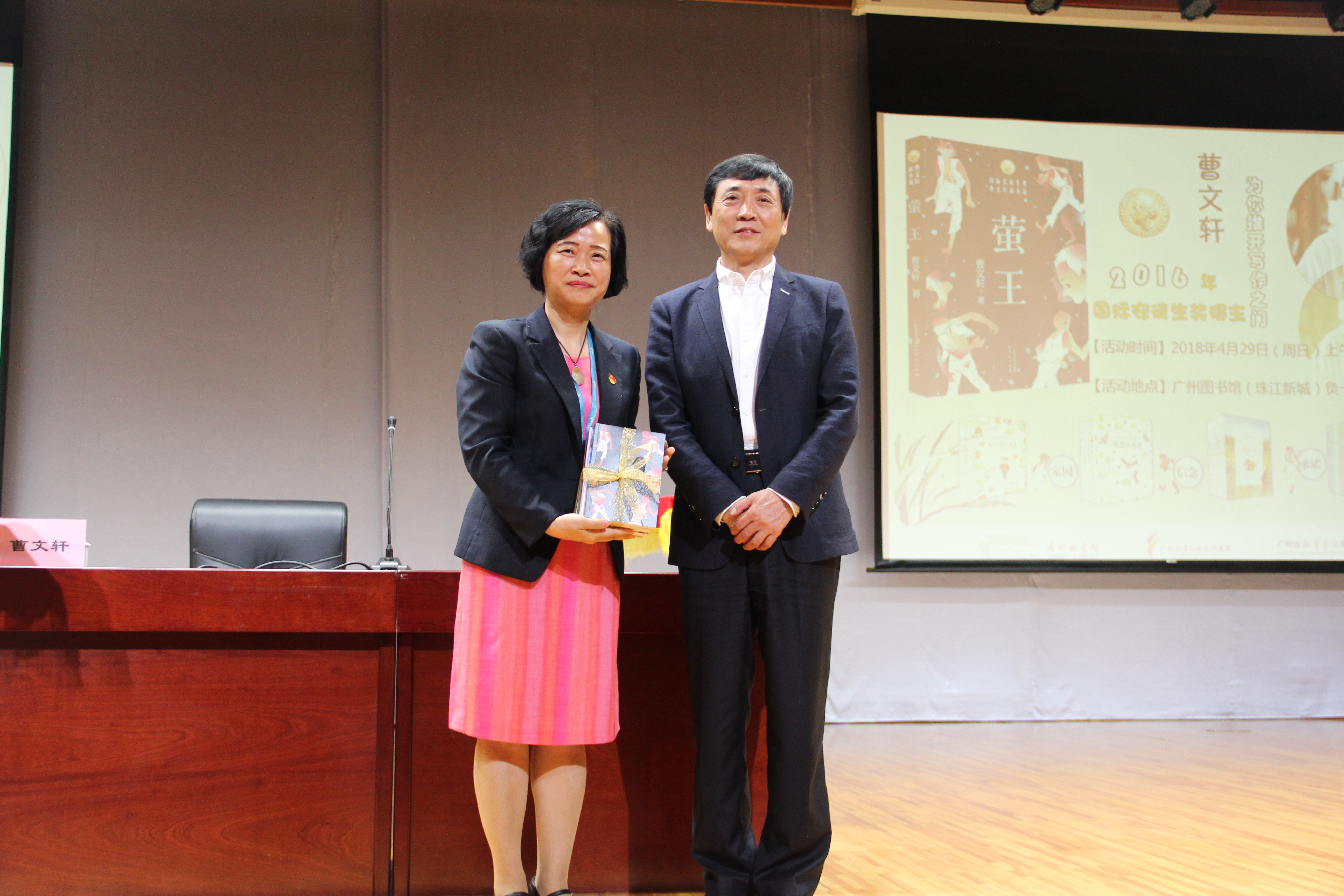 终于等到讲座开始啦!曹老师热情地向现场的大小读者问好,平易近人,亲和力满满。曹老师先向广州图书馆送上自己亲笔签名的代表作,由李慧敏副馆长代表我馆接受赠书。