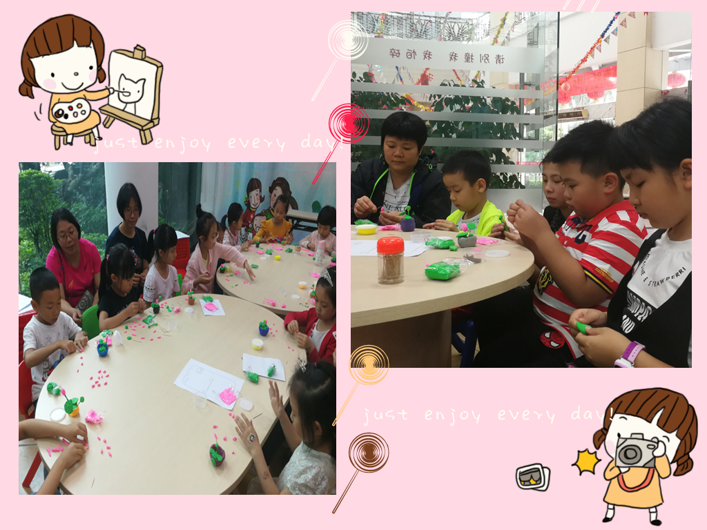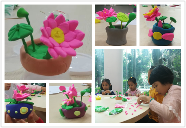 小朋友们不仅头脑聪明,更是心灵手巧。在手工环节,宋老师一边讲述,一边示范,小朋友们聚精会神的听讲,独立制作自己的荷花盆景。绿色的超轻黏土在手心按压,手掌的纹路形成自然的荷叶脉络,或大或小, 或浮在水面,或立在水面上。半圆的黏土用牙签扎出凹洞,可爱的莲蓬屹立水中央,粉红的花苞和绽放的荷花在荷叶中亭亭玉立。小朋友选择自己喜欢的颜色做成圆形、方形、元宝形的花盆,并用花朵、蜻蜓等装饰自己的盆景。每个小朋友作品都是独一无二的,非常可爱。