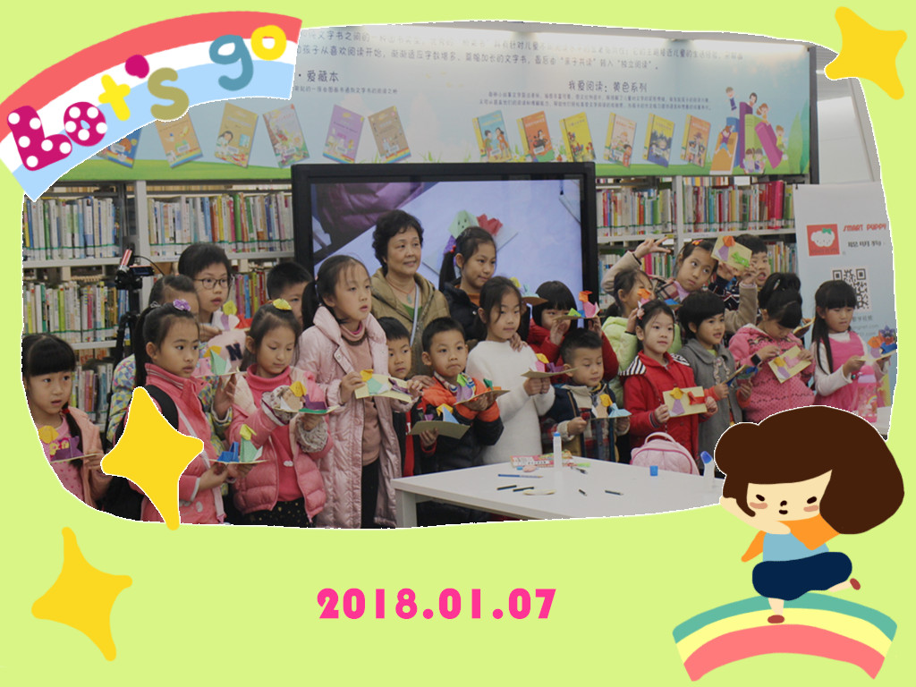 2018年的第一个周日,1月7日,迪通公司的韩老师如约而至,韩老师拥有几十年的教学经验,退休后义务参与图书馆活动,专业技能强又有爱心,是小朋友的良师益友。折纸活动一如既往的人声鼎沸,小朋友在韩老师的指导下,一步步完成折纸步骤,家长也在一旁看的目不转睛,跃跃欲试。精彩的讲解和细心的指导指点,在韩老师的轻声细语中,彩纸小狗栩栩如生,形态百变,小朋友们将小狗黏在卡纸上,立体又生动。活动结束,小朋友手举各色折纸作品,开心留影,2018的年第一场在欢声笑语中结束。