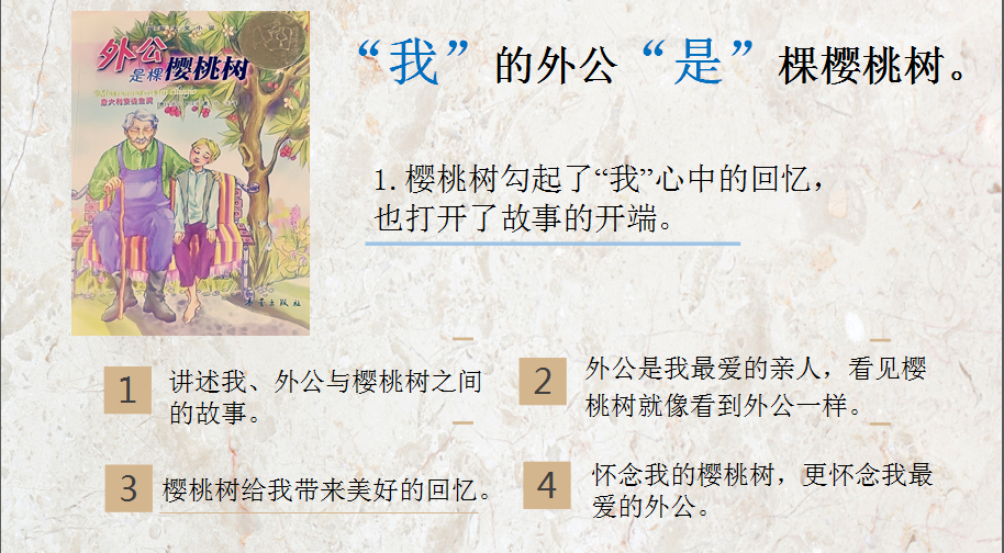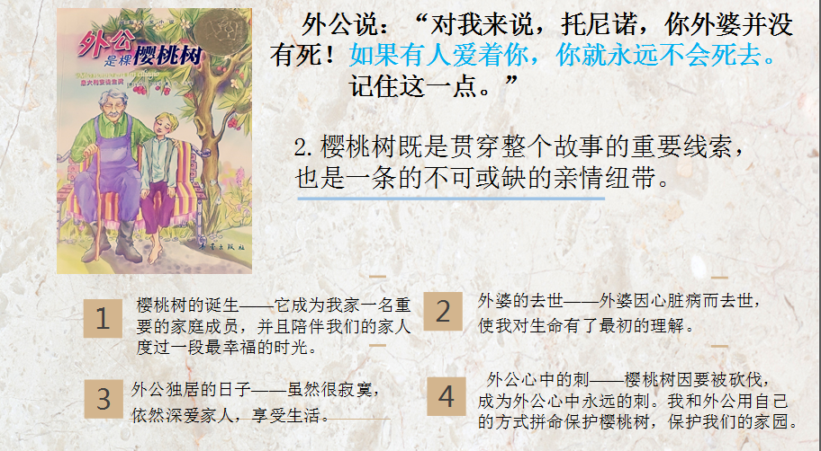 《外公是棵樱桃树》以“我”——小男孩托尼诺对外公与樱桃树的回忆,讲述了发生在家人之间“爱”的故事。