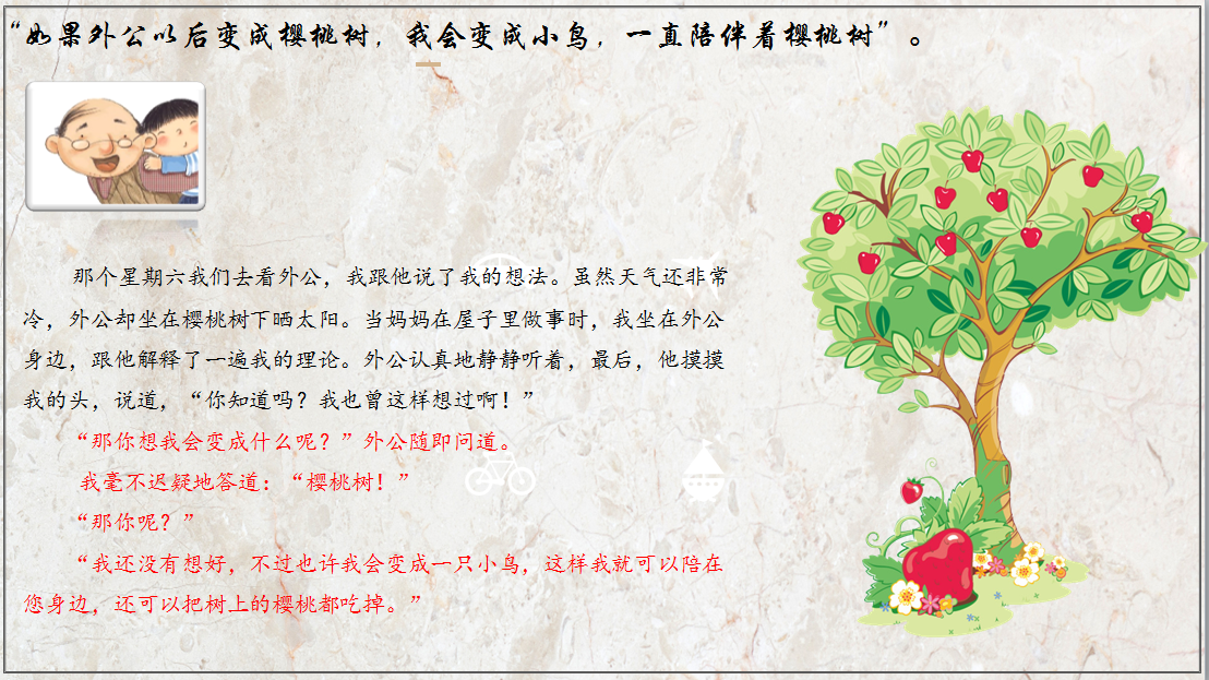 当“我”真正地理解了外公的想法与意图之后,“我”对外公说:“当您变成一棵樱桃树,也许,我以后会变成一只小鸟,这样我就可以陪在您身边,还可以把树上的樱桃都吃掉。”这句虽稚气却感人的话语不禁让人想起电影《寻梦环游记》中的“真正的死亡是世界上再没有一个人记住你”,表达的都是对生命的认识,对亲情的珍视和对亲人的爱。