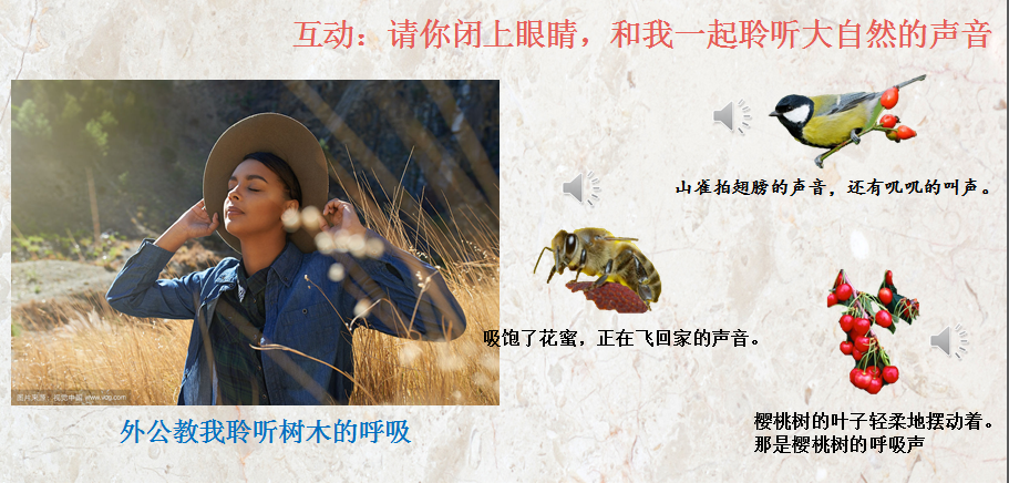 每讲述一段故事情节后,方老师就提出一些与情节主题相关的题目与小读者进行讨论,例如 “外公为什么那么喜欢那棵樱桃树呢?”“外公为什么把阿凤当成外婆呢?”“为什么在我的眼里,外公变成一棵樱桃树?而不是其它东西呢?”有趣的问题,激起了小读者的思考与讨论的热情。