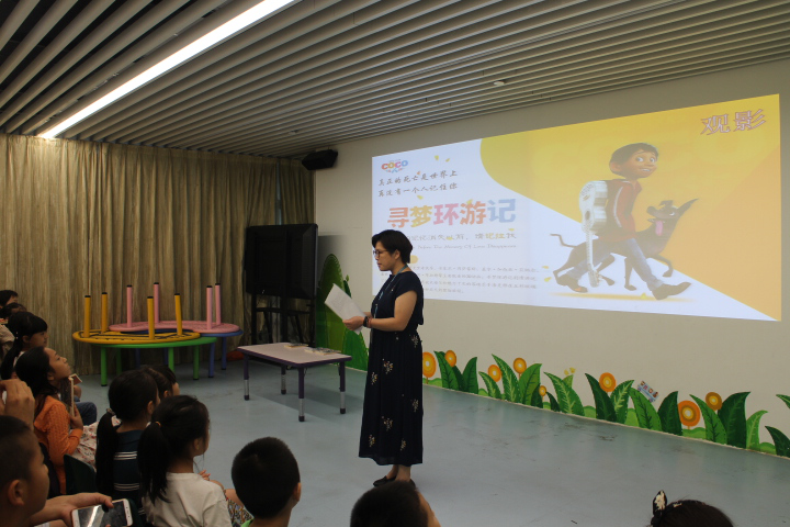 图书分享过后,方老师和小读者们一起观看同样以亲情为主题的电影:《寻梦环游记》,讲述一个12岁墨西哥小男孩米格,在追求音乐的梦想过程中和死去的祖父一段奇妙的相遇。电影强调“只要永远在家人的心中,生命永远不会消逝,只有亲人才是最重要的”。