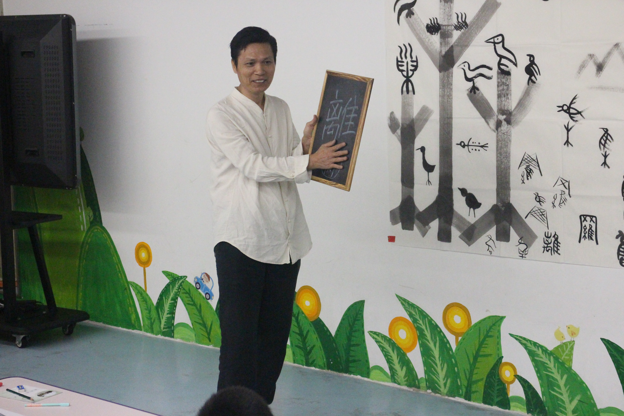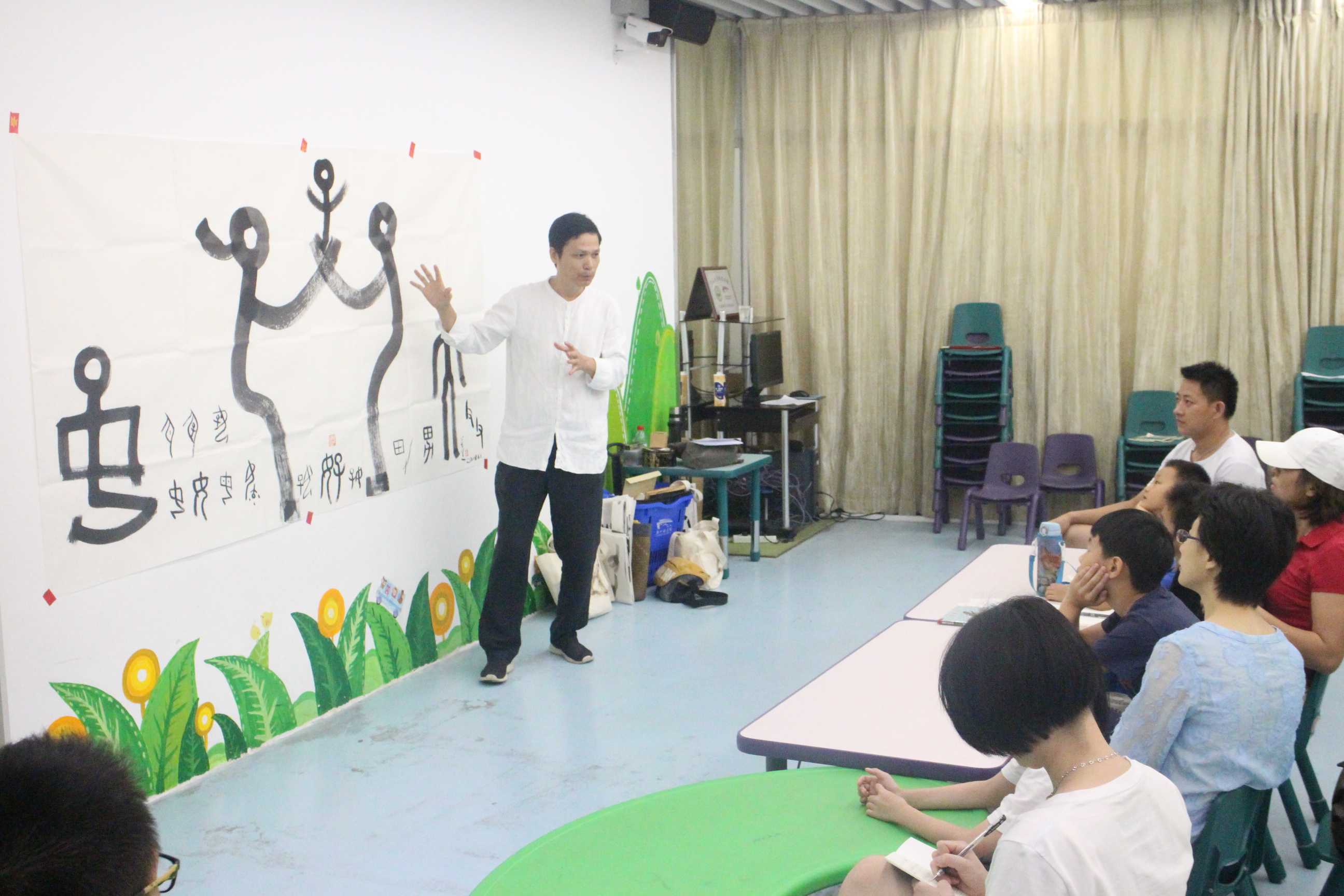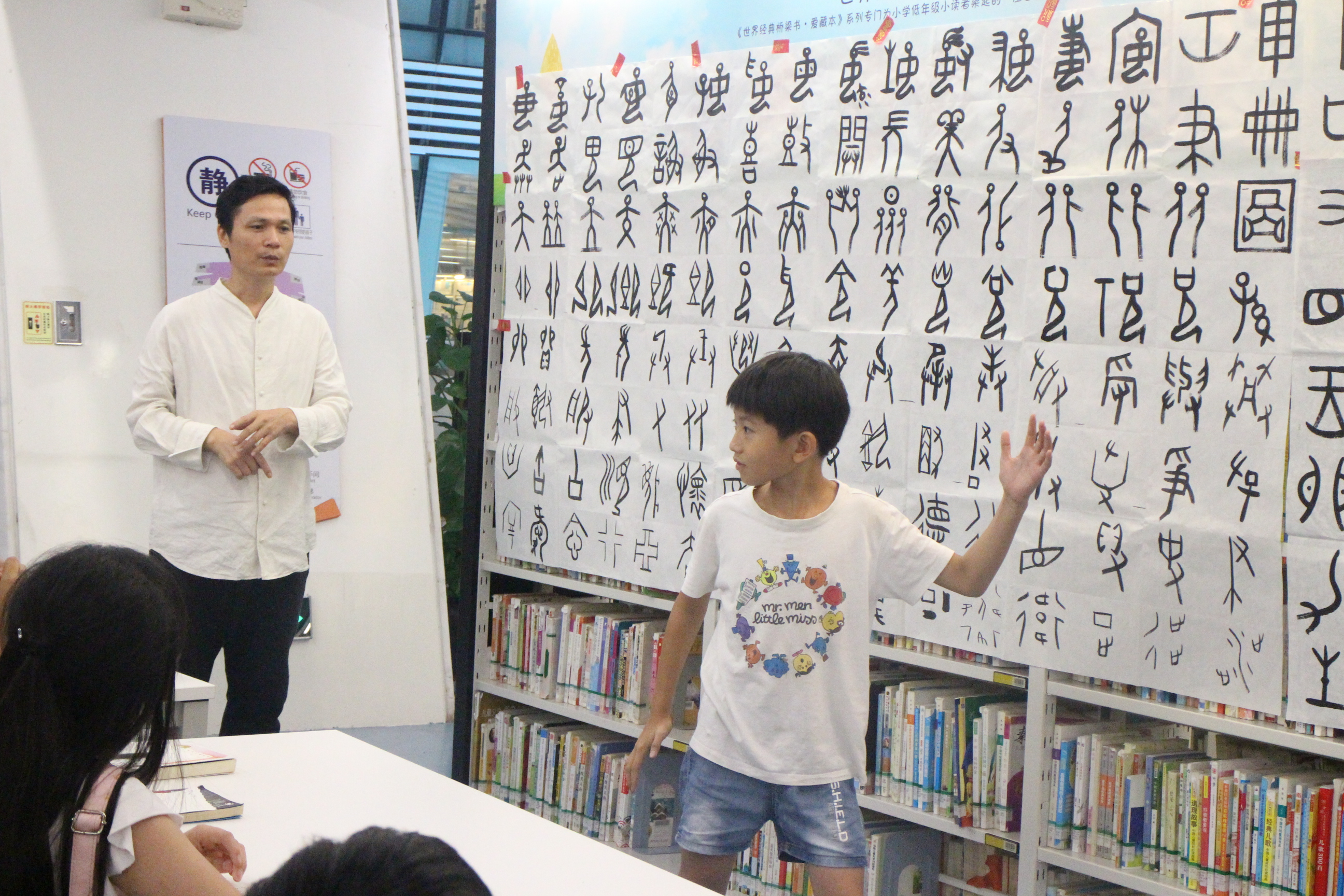 “你们猜一猜,这幅画里有哪些汉字呢?” 2018年7月16日——2018年7月20日,儿童暑期创意汉字启蒙活动在广州图书馆举办,活动主讲人是平面设计师、专注于儿童汉字启蒙教育的秦万里老师。一张白纸,几点笔墨,秦老师给小朋友们带来了精彩的“画里寻字”活动。从甲骨文、金文,到篆书、隶书,再到楷书、行书,秦老师再现了汉字的演变源流。大幅留白的纸张上融入了秦老师的创作心血,秦老师说,PPT投影所产生的文字感知力不如纸笔作画,因此,在所有的课堂教学中,秦老师坚持用自己的一笔一划,向小朋友展示汉字发展过程中的动态美。