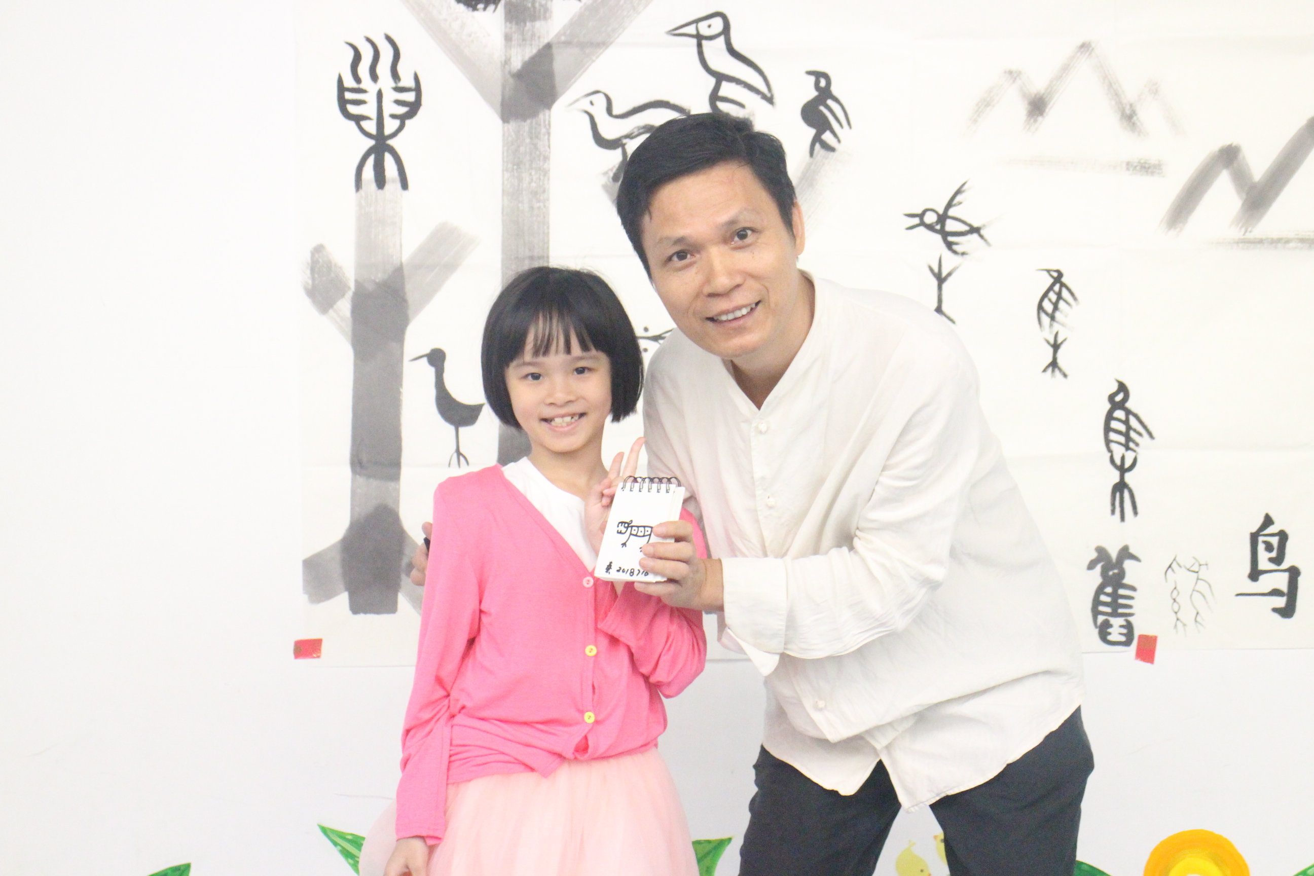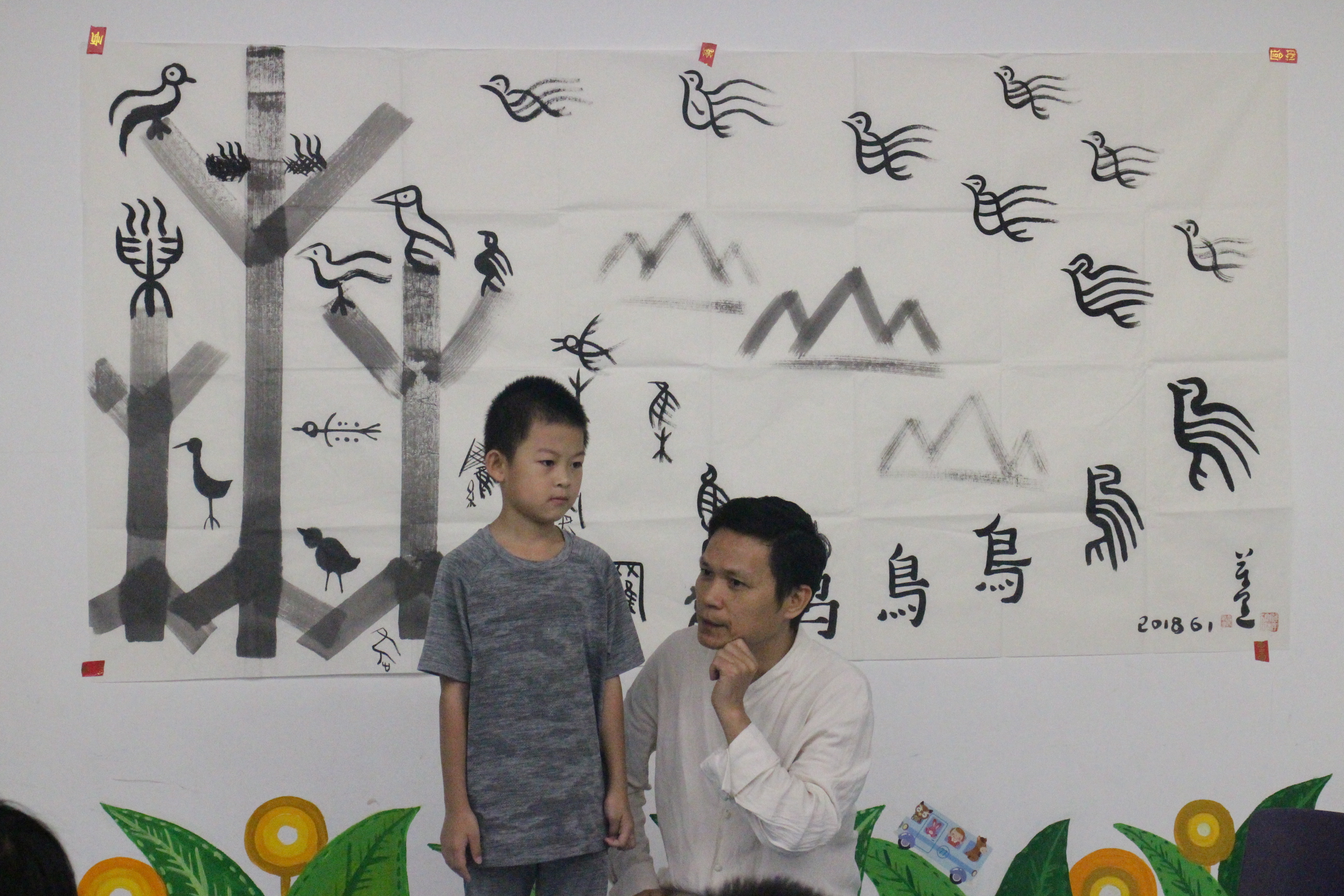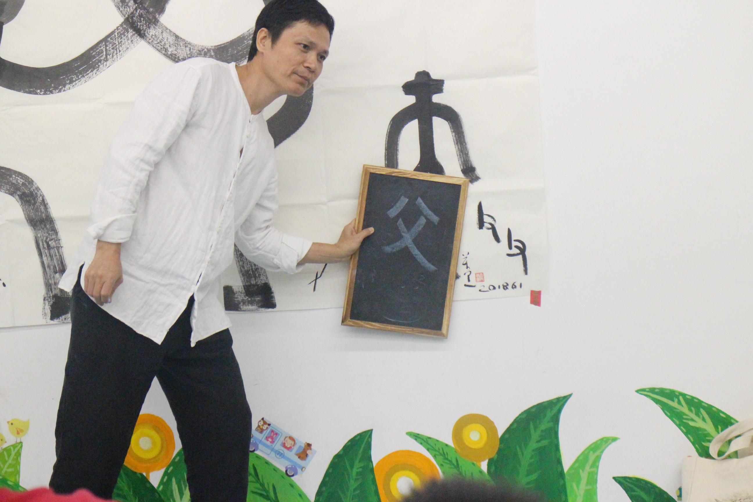 “你们猜一猜,这幅画里有哪些汉字呢?” 2018年7月16日——2018年7月20日,儿童暑期创意汉字启蒙活动在广州图书馆举办,活动主讲人是平面设计师、专注于儿童汉字启蒙教育的秦万里老师。一张白纸,几点笔墨,秦老师给小朋友们带来了精彩的“画里寻字”活动。从甲骨文、金文,到篆书、隶书,再到楷书、行书,秦老师再现了汉字的演变源流。大幅留白的纸张上融入了秦老师的创作心血,秦老师说,PPT投影所产生的文字感知力不如纸笔作画,因此,在所有的课堂教学中,秦老师坚持用自己的一笔一划,向小朋友展示汉字发展过程中的动态美。