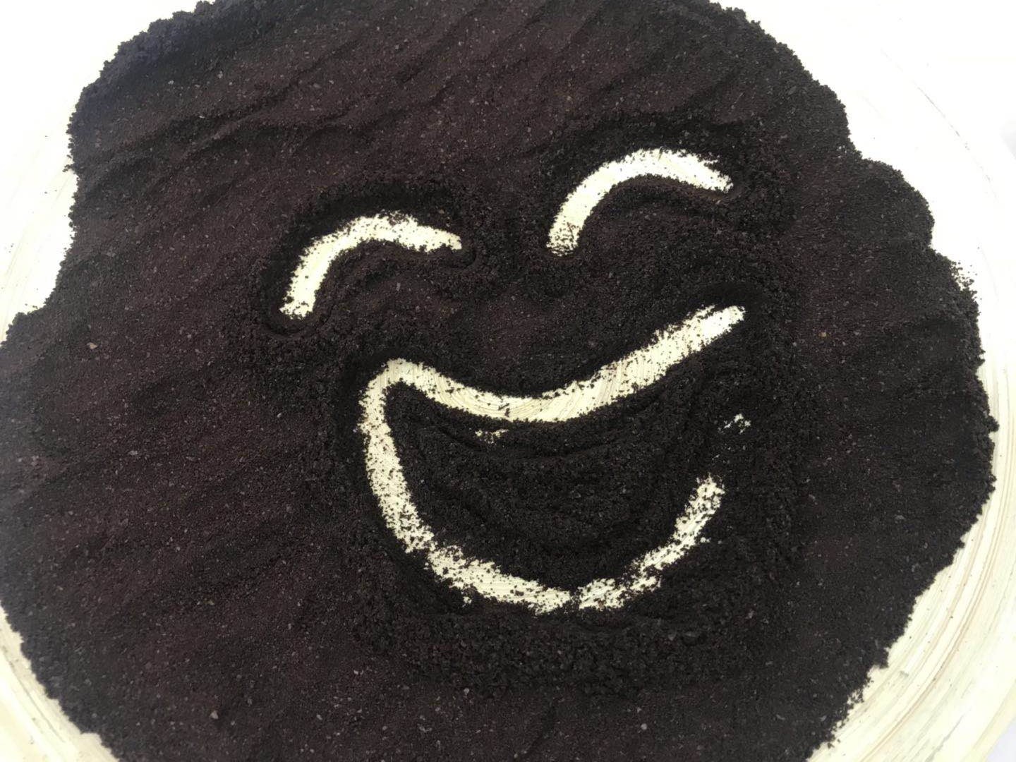 咖啡画画和沙盘画画类似,是一款通过视觉、嗅觉和触觉等多感官刺激,加深小朋友对汉字的理解和记忆的游戏。秦老师特别强调,咖啡的色、香、味和沙子有显著区别,对小朋友来说,咖啡画字和沙盘画字体验完全不同。因此,活动开始前,秦老师将事先备好的咖啡倒入2个木质圆盘,“猜猜,这是什么?”秦老师指着咖啡,问刚刚走进小剧场的小朋友。“是咖啡!”小朋友们对这份意料之外的学习材料好奇极了!他们趴在桌前,一会儿闻闻咖啡香,一会儿摸摸圆盘,忙得不亦乐乎。