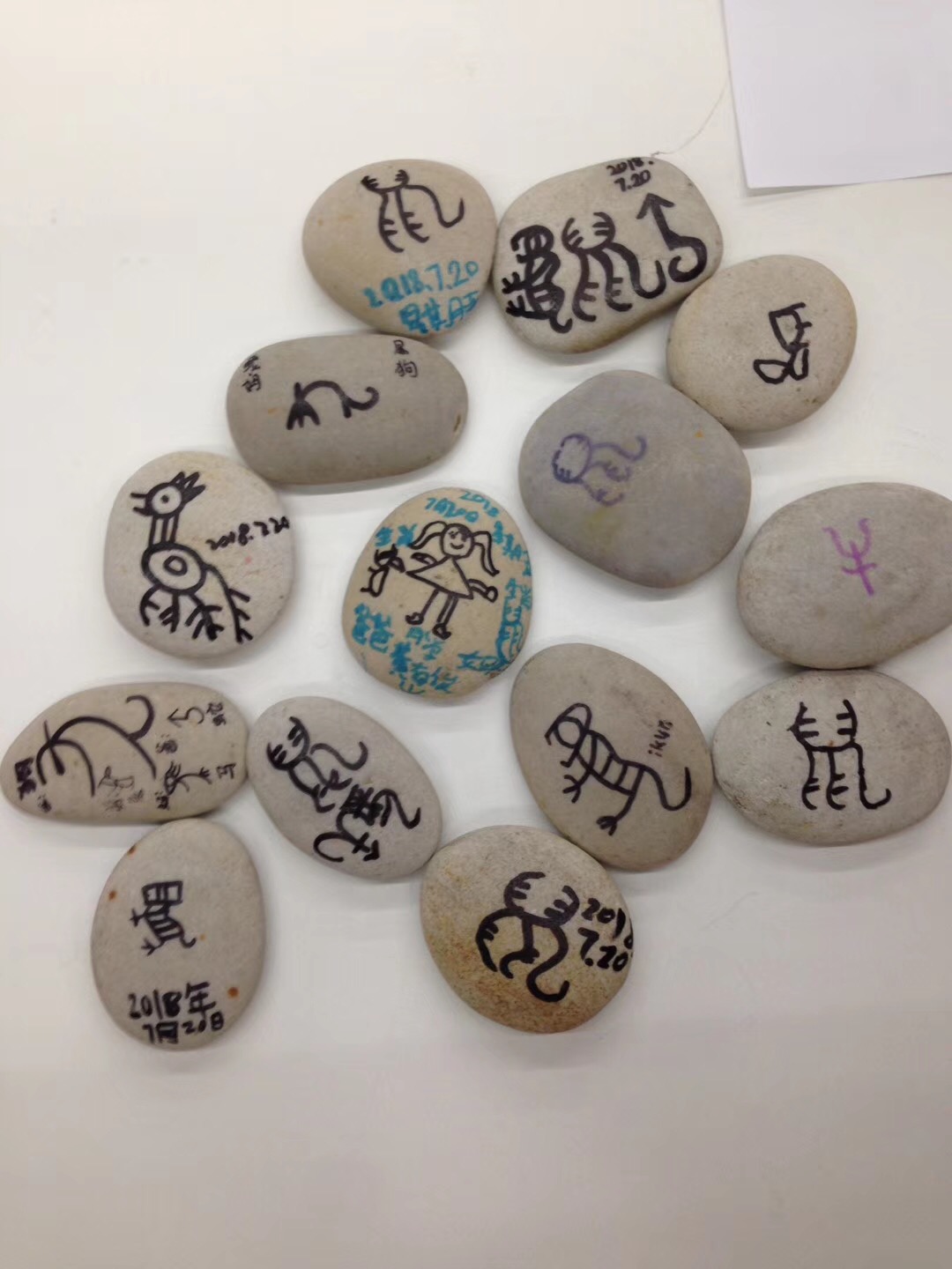 秦老师十分强调小朋友的动手能力,他在上课之余,为小朋友们准备了光滑的鹅卵石,作为小朋友创作的工具。秦老师在课堂上向小朋友展示了十二生肖的象形文字,听完课的小朋友可以从秦老师手中接过鹅卵石,对照着老师展示的生肖画画。参加活动的小朋友兴奋不已,十分喜欢这个亲手制作的礼物。