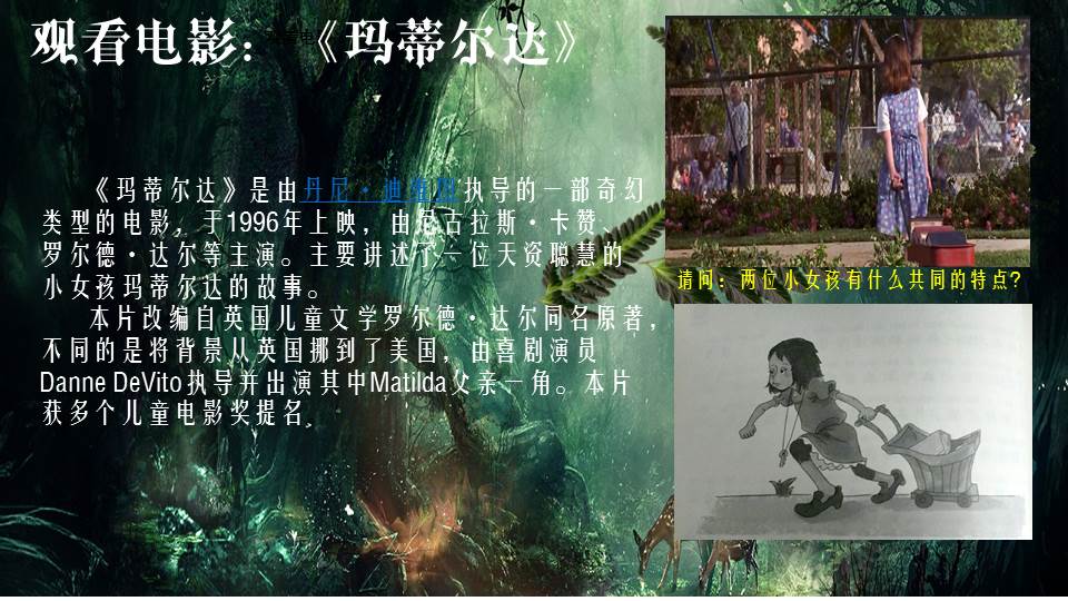 * 观看电影《玛蒂尔达》,看看智慧小巫仙玛蒂尔达魔幻的学校生活。