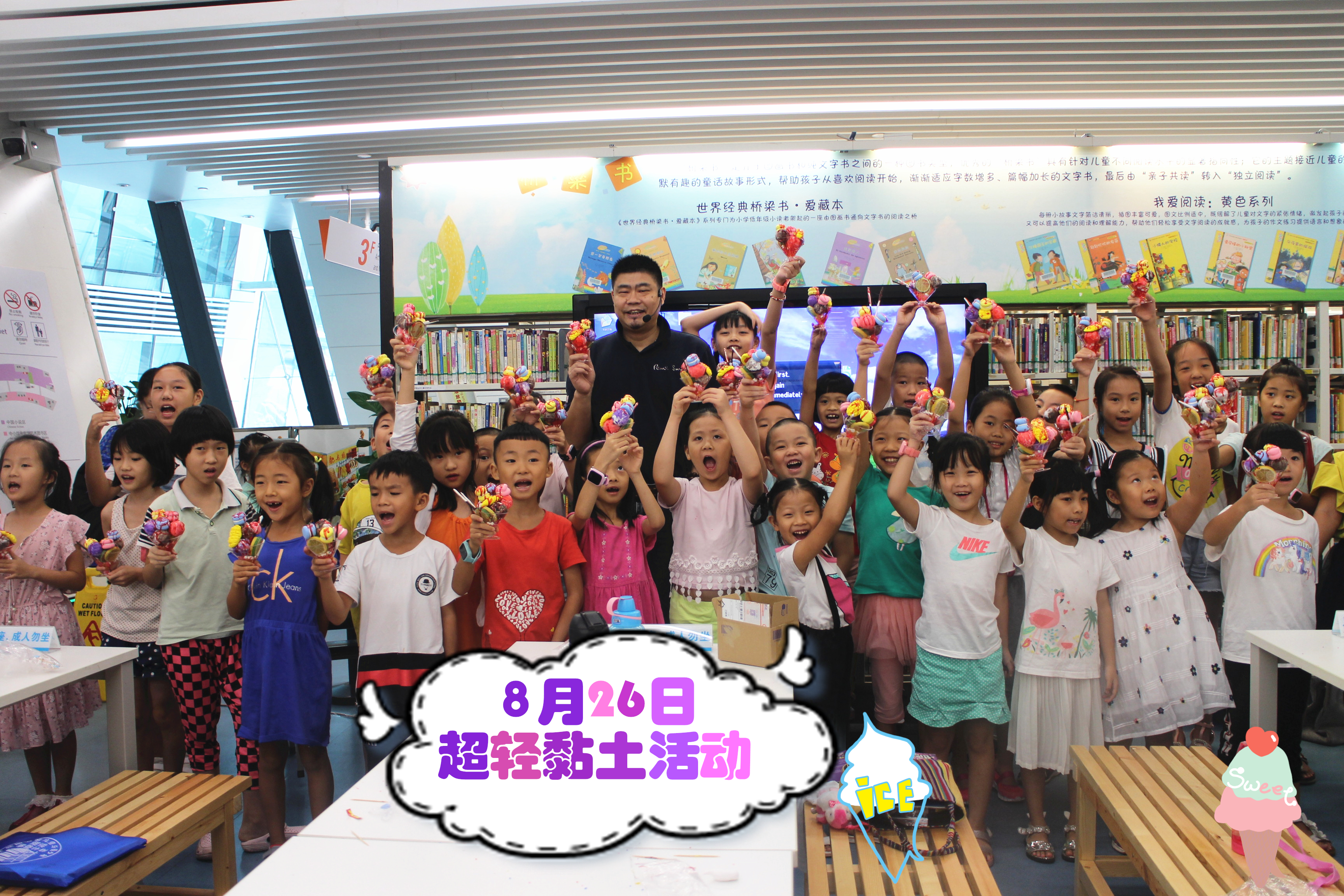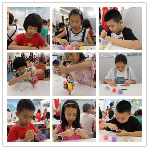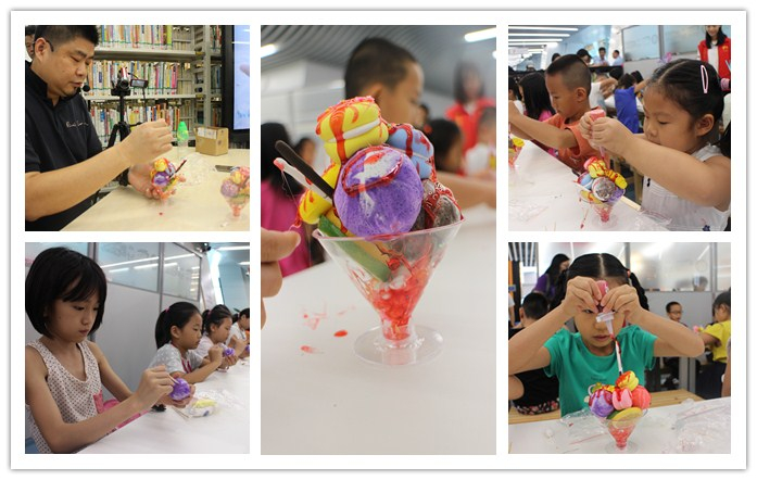 冰淇淋绵软香甜,马卡龙色彩缤纷。8月26日,太史老师给小朋友们带来了轻黏土制作“甜蜜一夏”——马卡龙冰淇淋。老师耐心地介绍冰淇淋、马卡龙、芒果片等黏土形状的捏制方法,“大家不要混学校,但在这里就要混色”太史老师风趣依旧,小朋友们一阵欢笑。不一会儿,圆圆的“三色冰淇淋”、扁扁的“三色马卡龙”、长条的“巧克力棍”……各色各样的“食物”在小朋友们的手里出现了。最后他们小心翼翼地把“食物”在杯子中拼好,再涂上“酱汁”。就这样,一道可远观而不可亵玩,更不可入口的精美甜品便大功告成了。虽然不能吃,小朋友们却也心满意足。