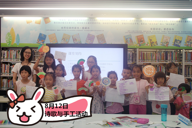 一首好诗,往往只谱写一段旋律,就能让你想象出美妙的交响;一首好诗,往往只跳跃一朵浪花,就能让你想象出翻涌的大海。8月12日,万物有灵诗歌学园的伍绮璇老师和小朋友们一起欣赏郭沫若的诗歌《天上的街市》。为了小朋友们能更好地理解这首诗,伍老师先通过“集市模仿秀”这一小游戏,让小朋友扮演集市里的店家和顾客,感受街市的热闹与喧嚣。接着师生共读绘本《荷花镇的早市》,并与《天上的街市》进行对比。随后,伍老师带着大家学习《天上的街市》,并让小朋友通过诗歌的形式展现自己心中天上街市的模样。最后伍老师与小朋友“诗心手作”,把街市里的水果变成一把能给我们带来习习凉风的水果扇子。这是一场手工与诗歌的完美邂逅!其活动形式多样,教学内容环环相扣,小朋友们在收获知识的同时,也玩得不亦乐乎。