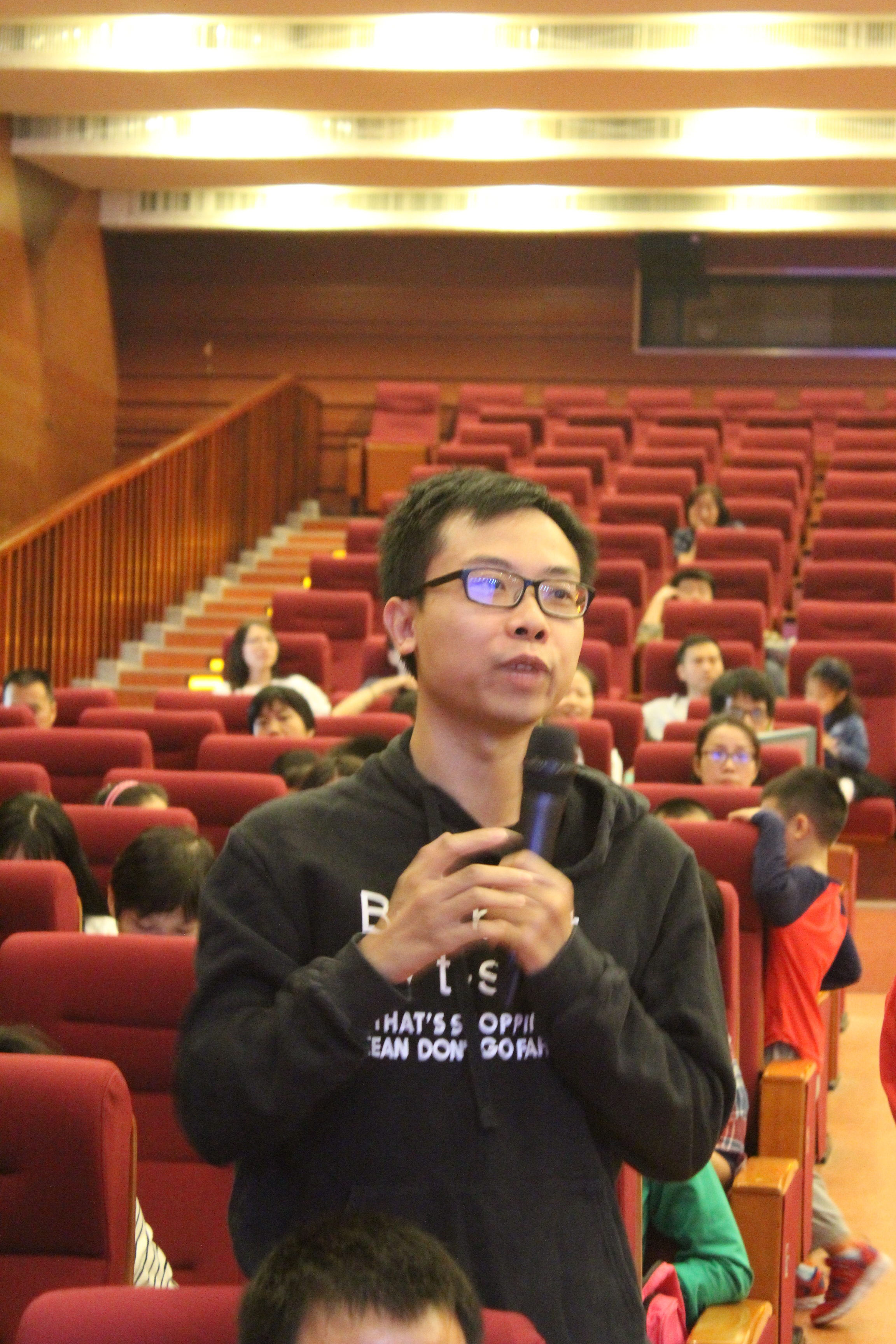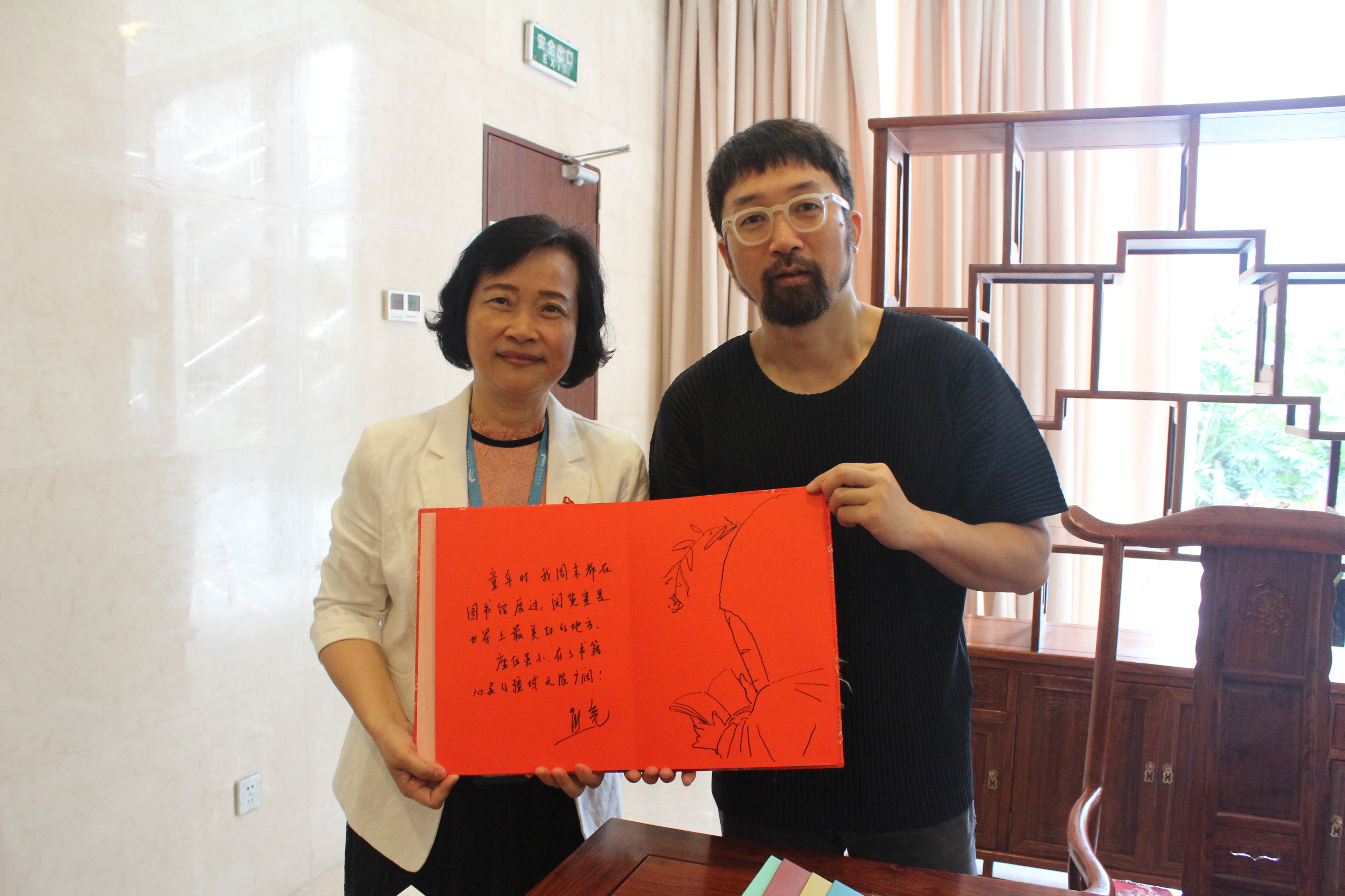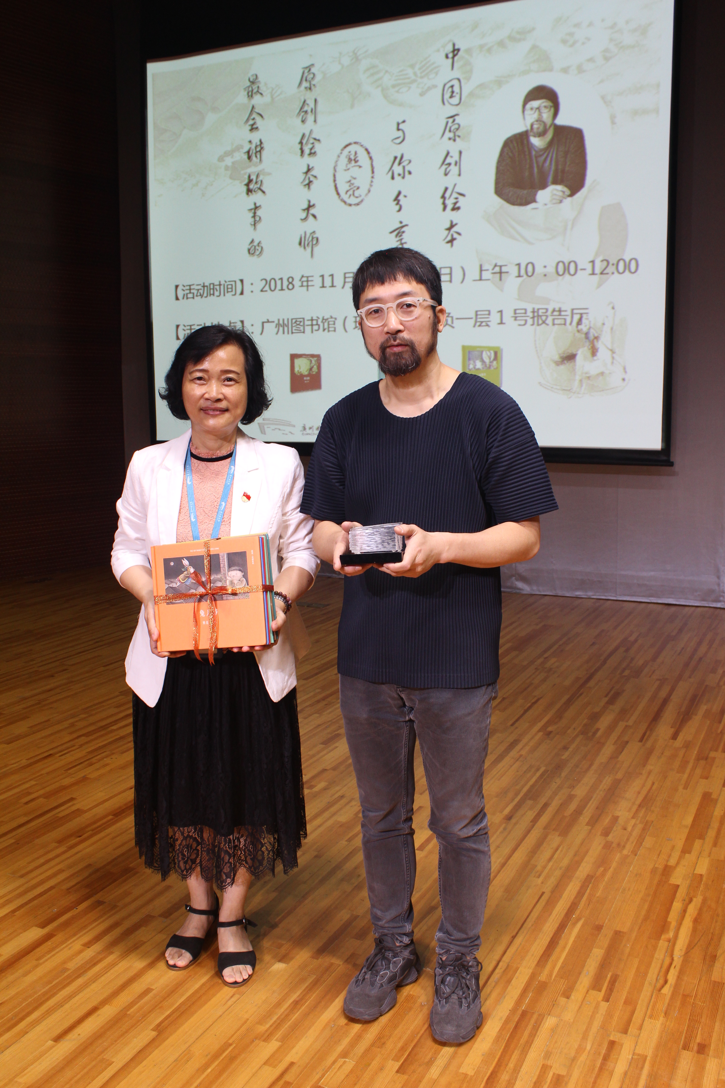 大络腮胡子、幽默风趣的谈吐、平易近人,亲和力满满……熊亮老师一上场就以独特的魅力“圈粉”无数。他先向广州图书馆送上自己亲笔签名的代表作,由李慧敏副馆长代表我馆接受赠书。接着,他以原创绘本作品《金刚师》开场,火、水、木头和风……这些看似普通的元素在老师的画笔下化身为一个个调皮捣蛋的小“机灵鬼”,以及它们和金刚师老师以对话方式展现的师生间有趣小故事,原汁原味的中国传统故事情节与现代水墨画风完美结合,实在妙不可言!