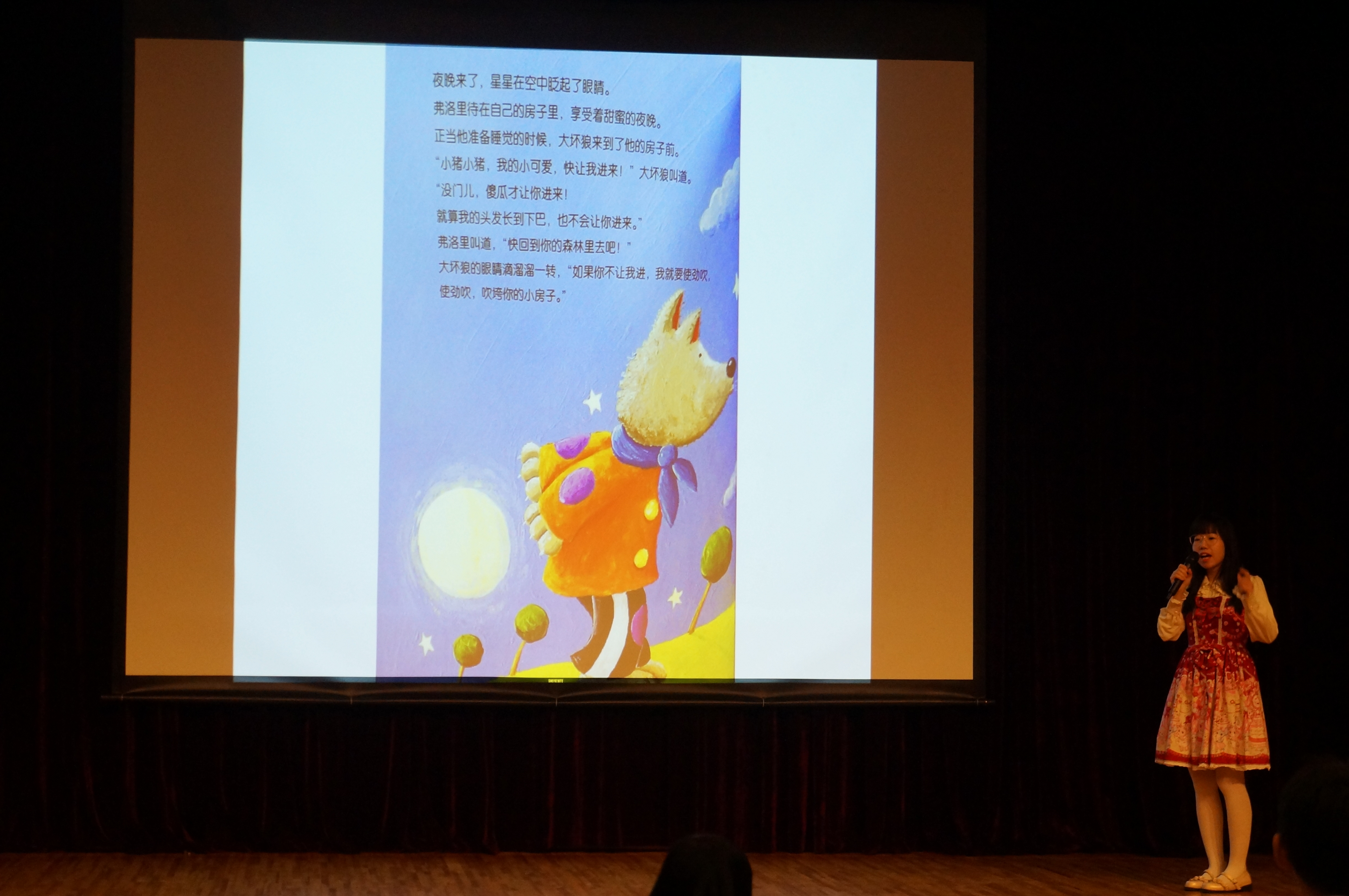 最后,大家期待已久的第四只“故事小猪”更是千呼万唤才出来。花仙子般的诗诗姐姐把《三只小猪》的故事娓娓道来。