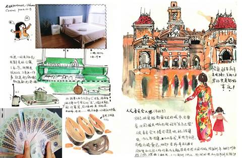 为了丰富画面的视觉效果,也可以使用一些好看的胶带或者带有花纹的尺子装饰画面。丹丹老师向我们展示了她的日本之旅和越南之旅的精彩手帐,完整版拉出来约有五米长,每一张都是满满的内容。有大标题,有旅程图片,有自己画的,也有景点的门票......