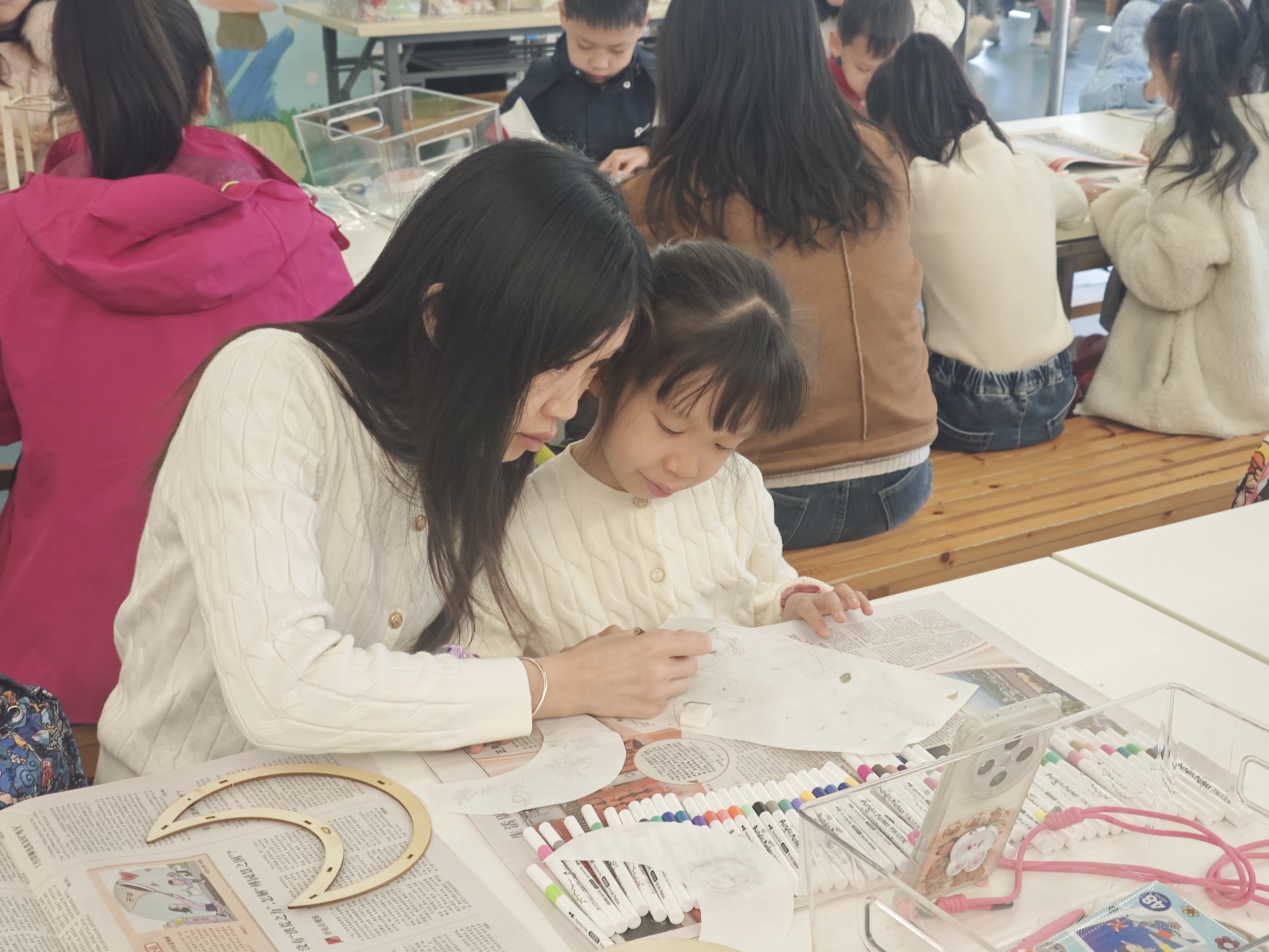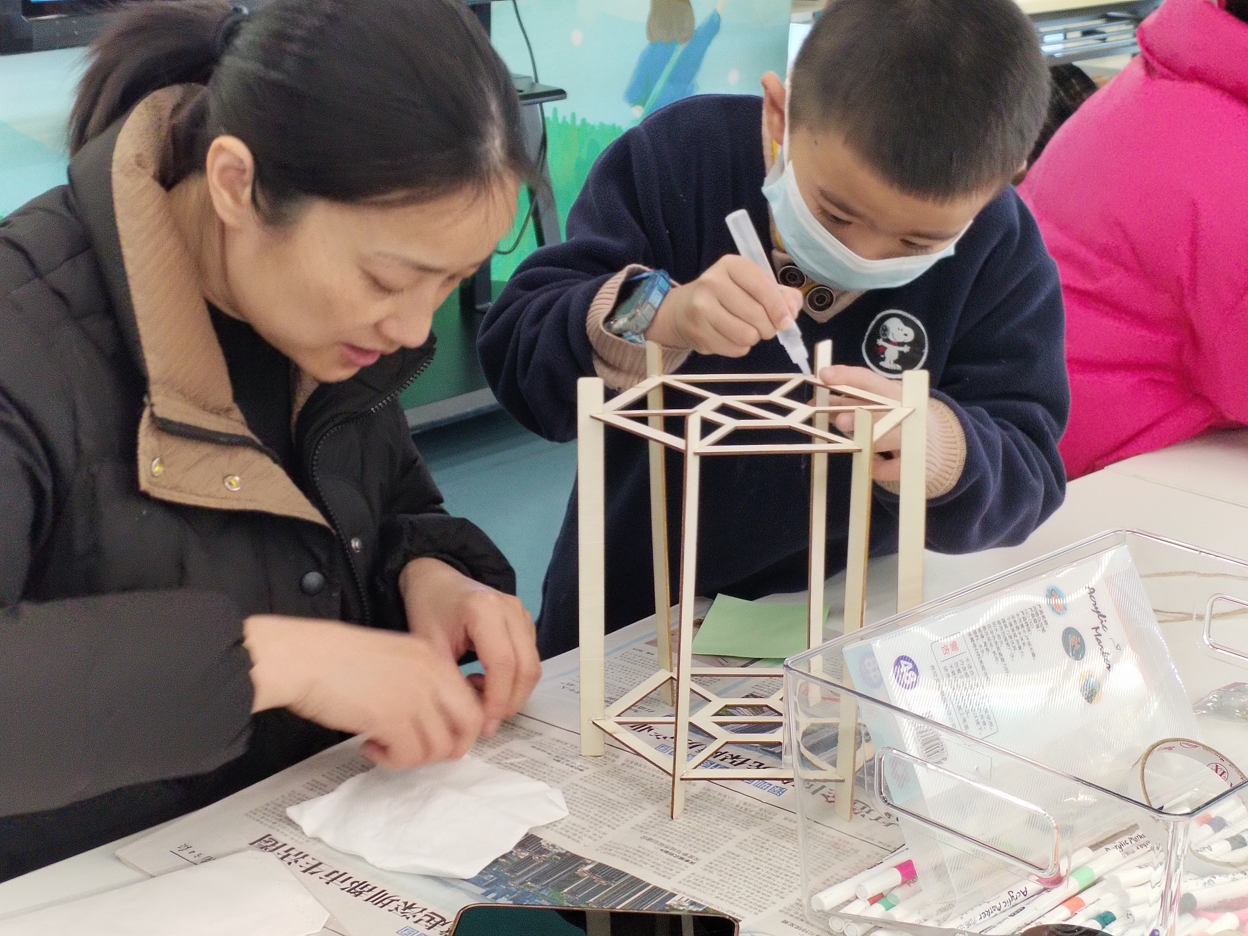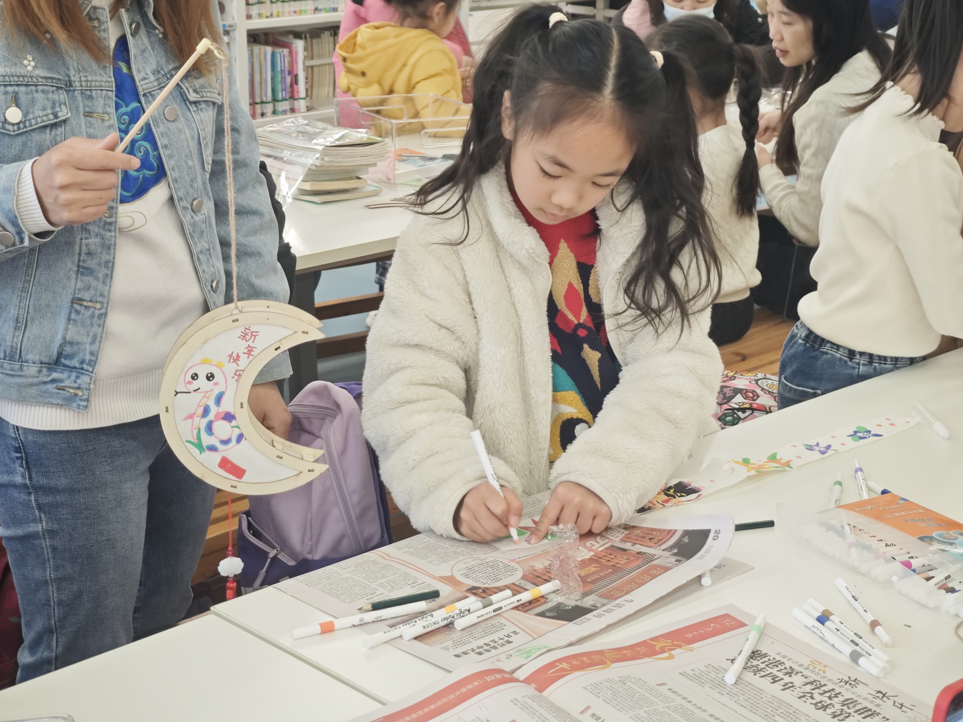 馆员宋老师通过课件和视频讲解制作灯笼的方法和技巧。老师和志愿者现场协助亲子家庭制作,鼓励孩子发挥想象力,画出不同的灯笼图案,家长们也积极参与其中,与孩子们一起动手制作,创作出独具特色的灯笼。