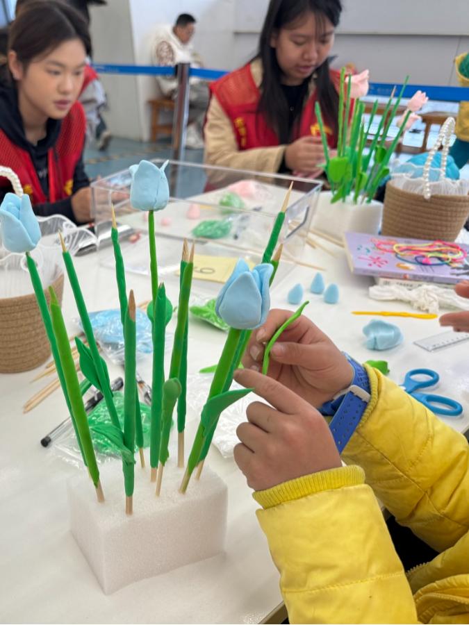 形态各异、色彩斑斓的粘土花朵在一双双巧手下诞生。