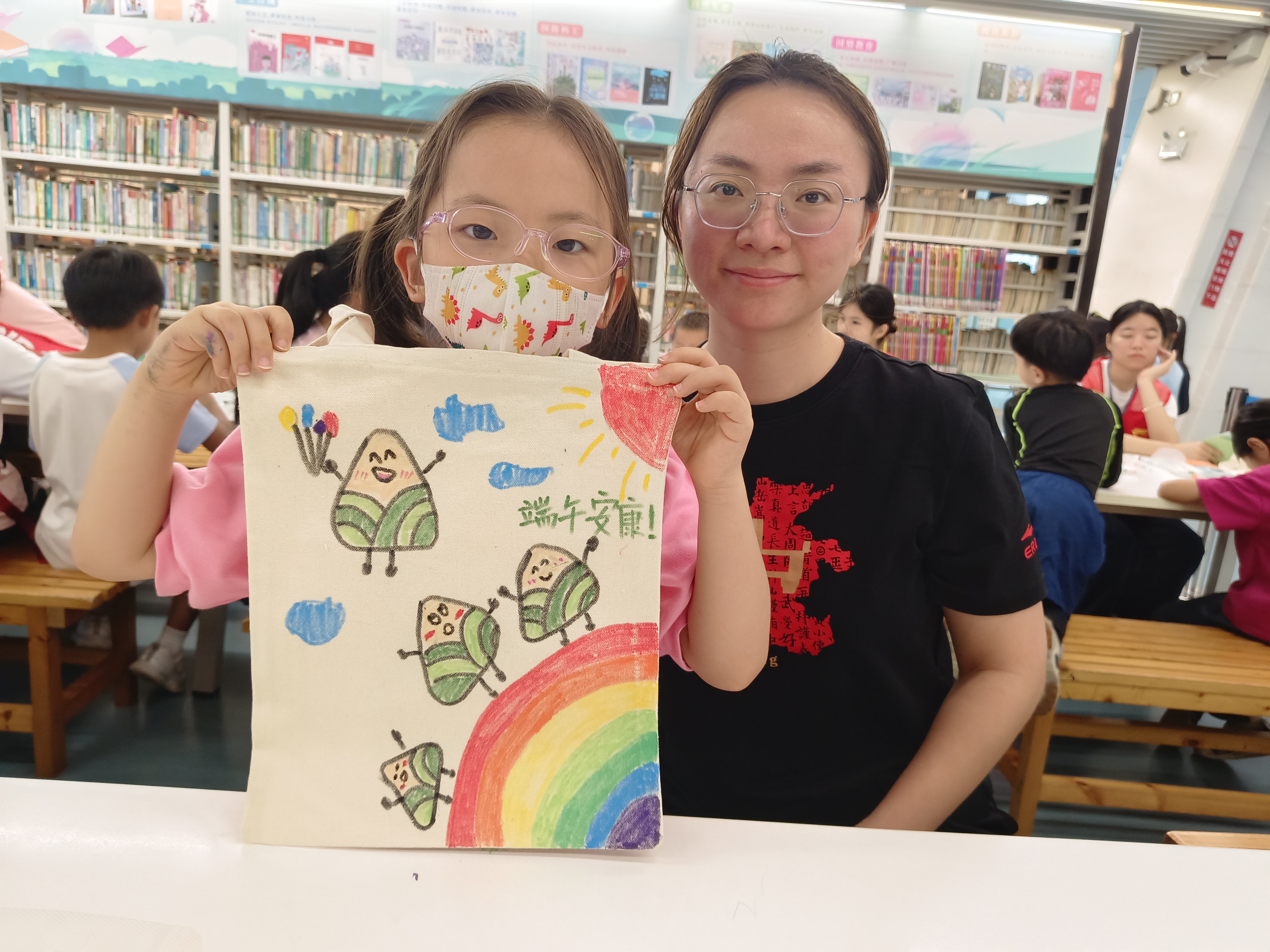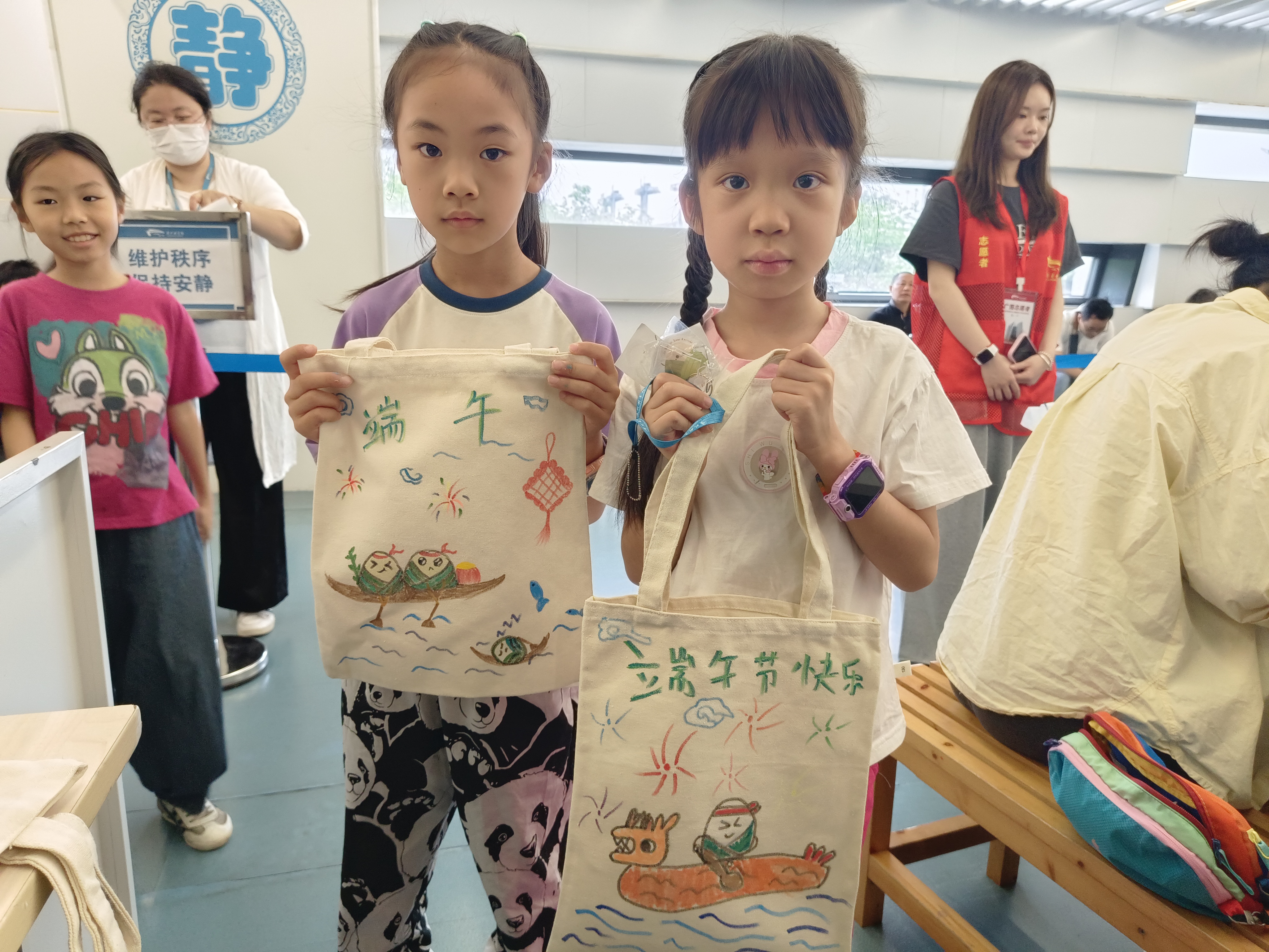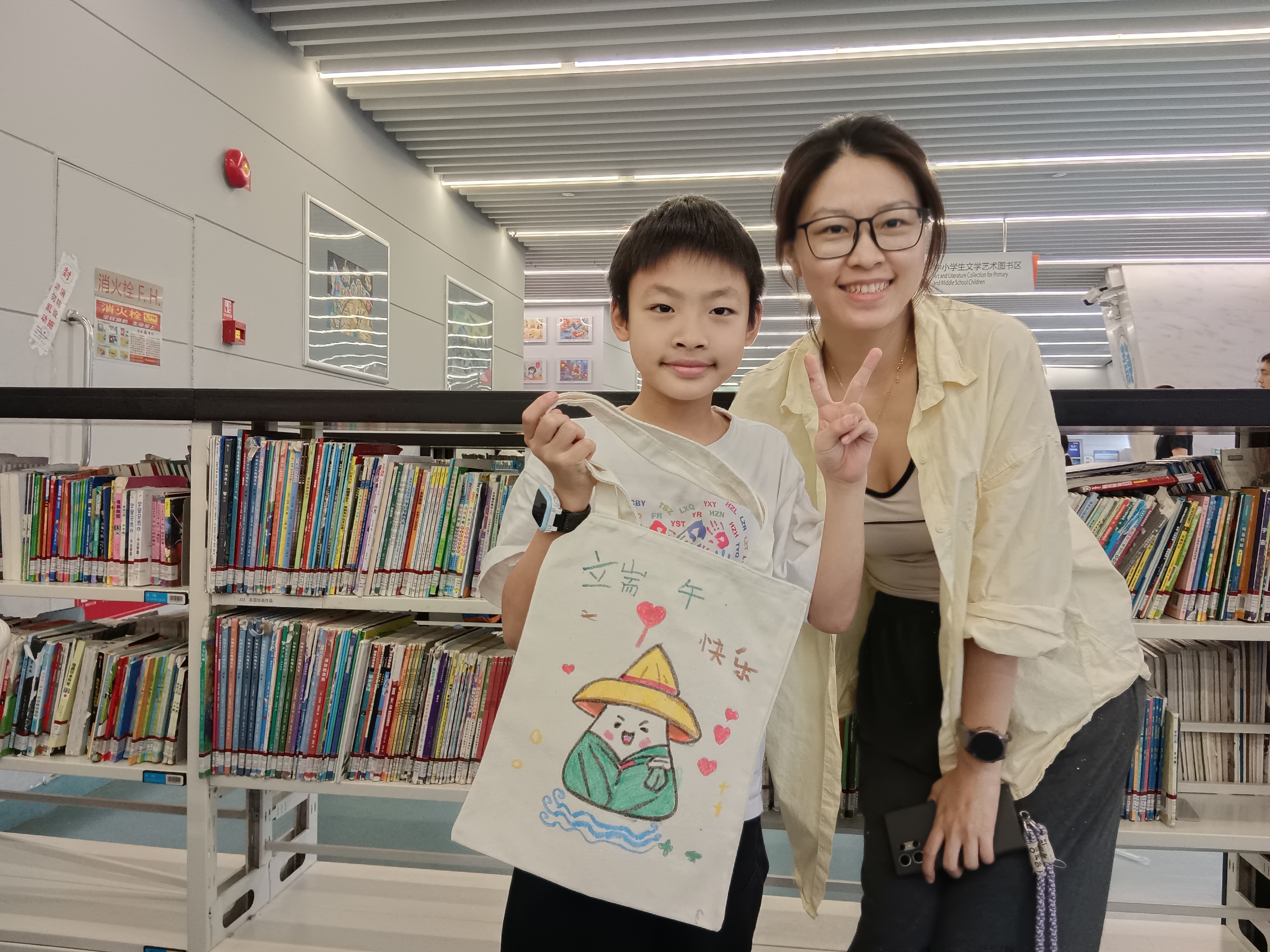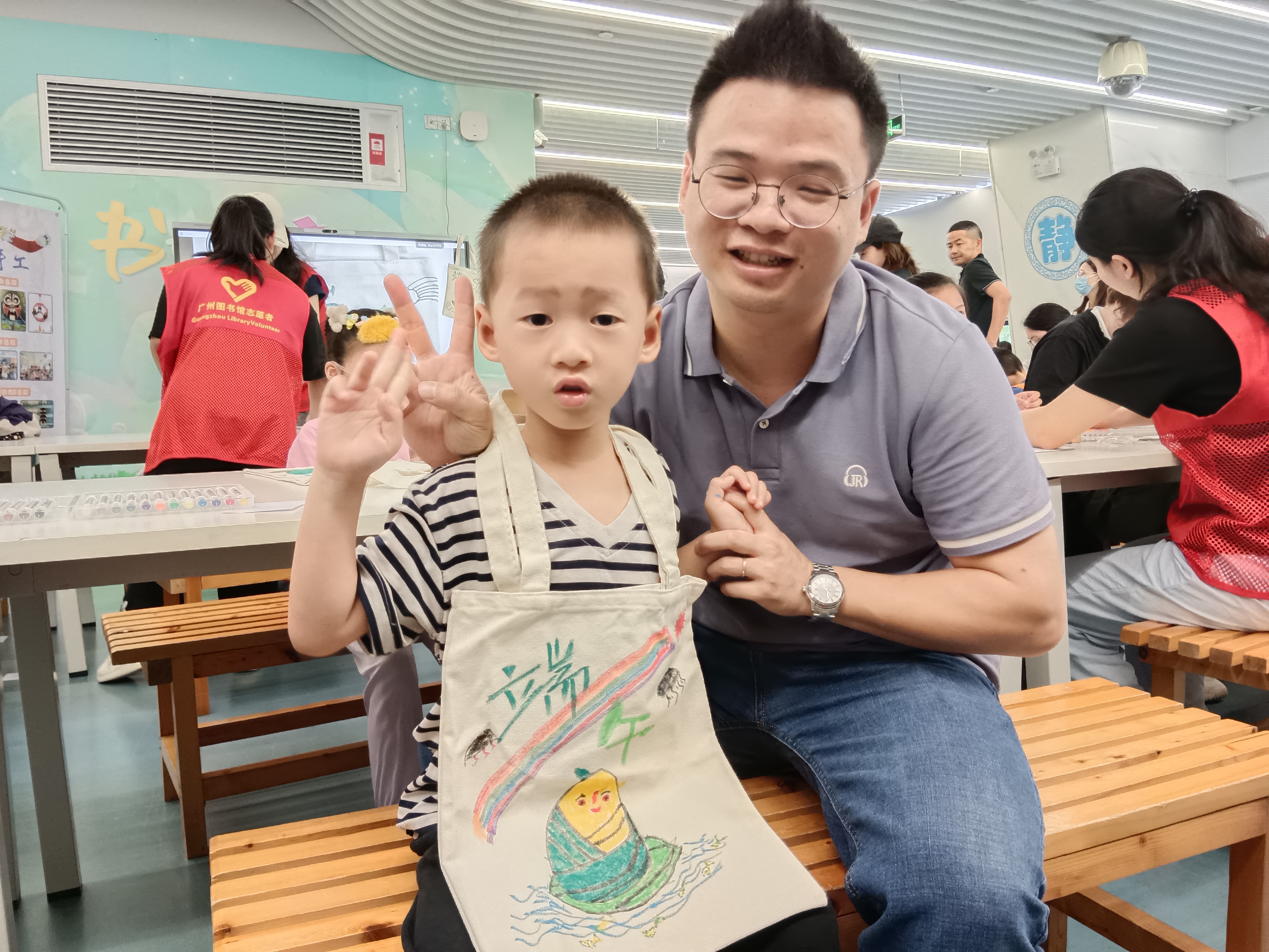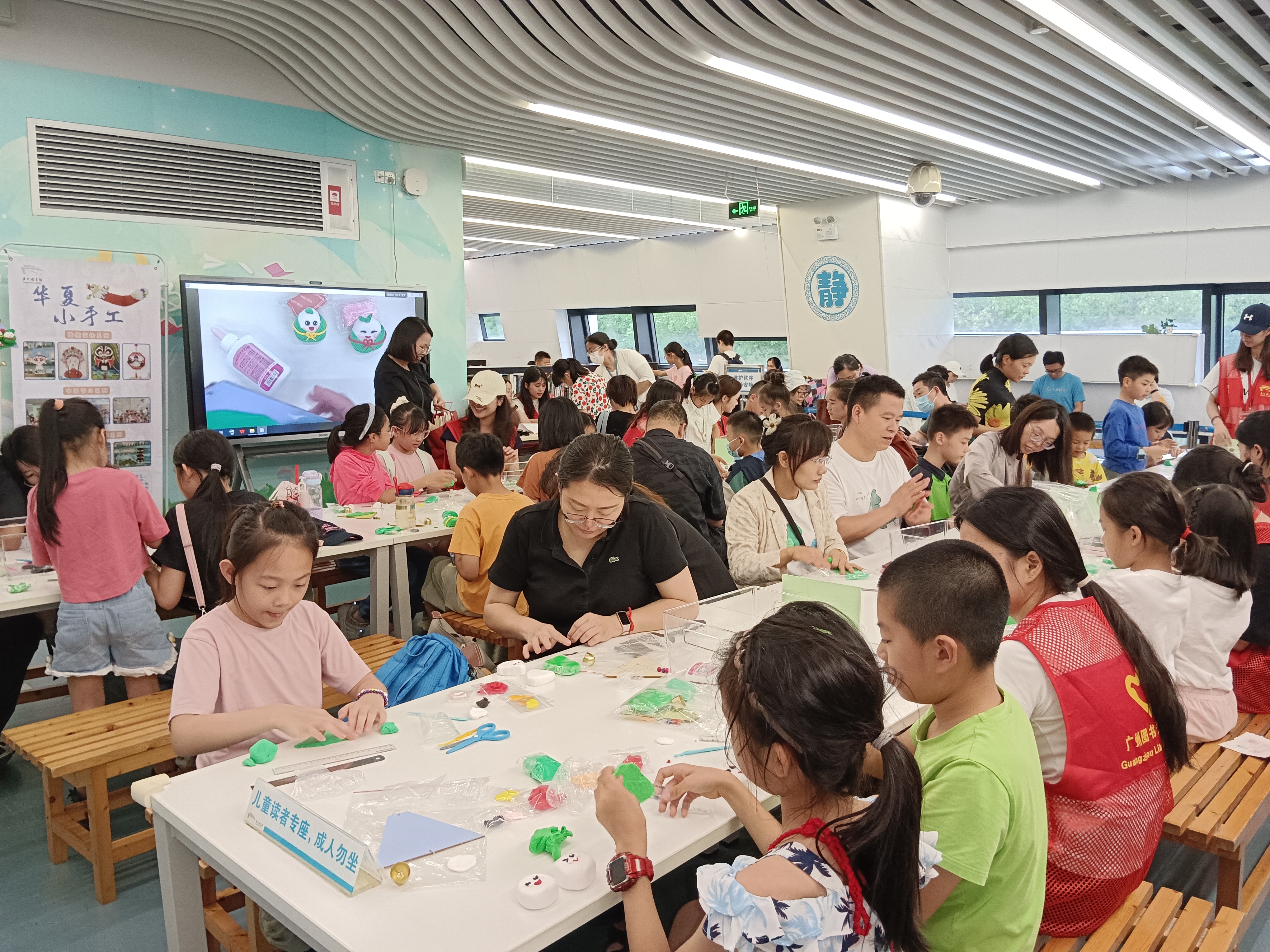 广州图书馆南楼三层“华夏小手工”活动于2025年5月25日热闹开展。宽敞明亮的空间里,长桌整齐摆放,画端午帆布袋、捏粽子风铃、做冰箱贴、拼贴小挂件,两百多组亲子家庭专注又认真。
