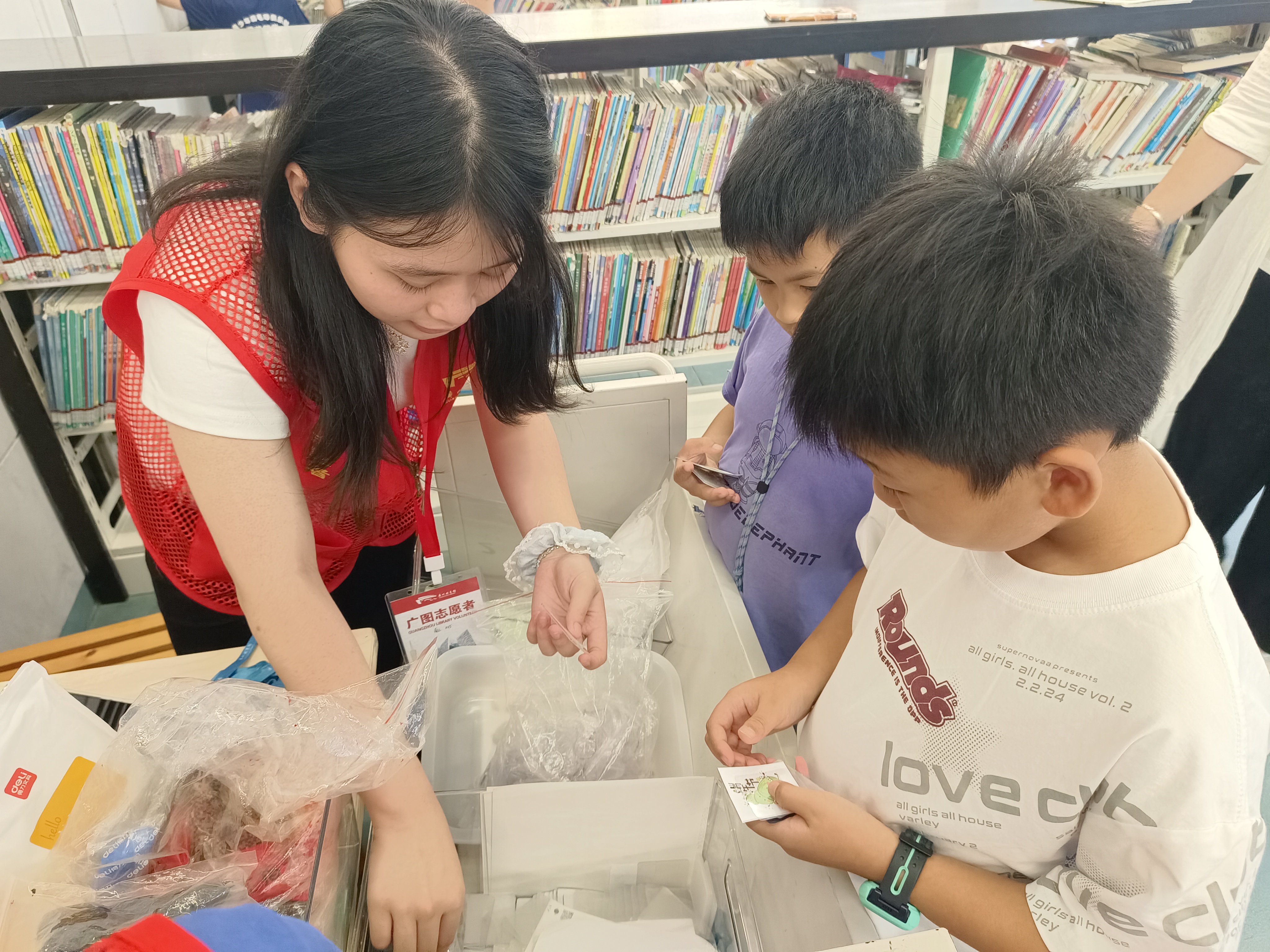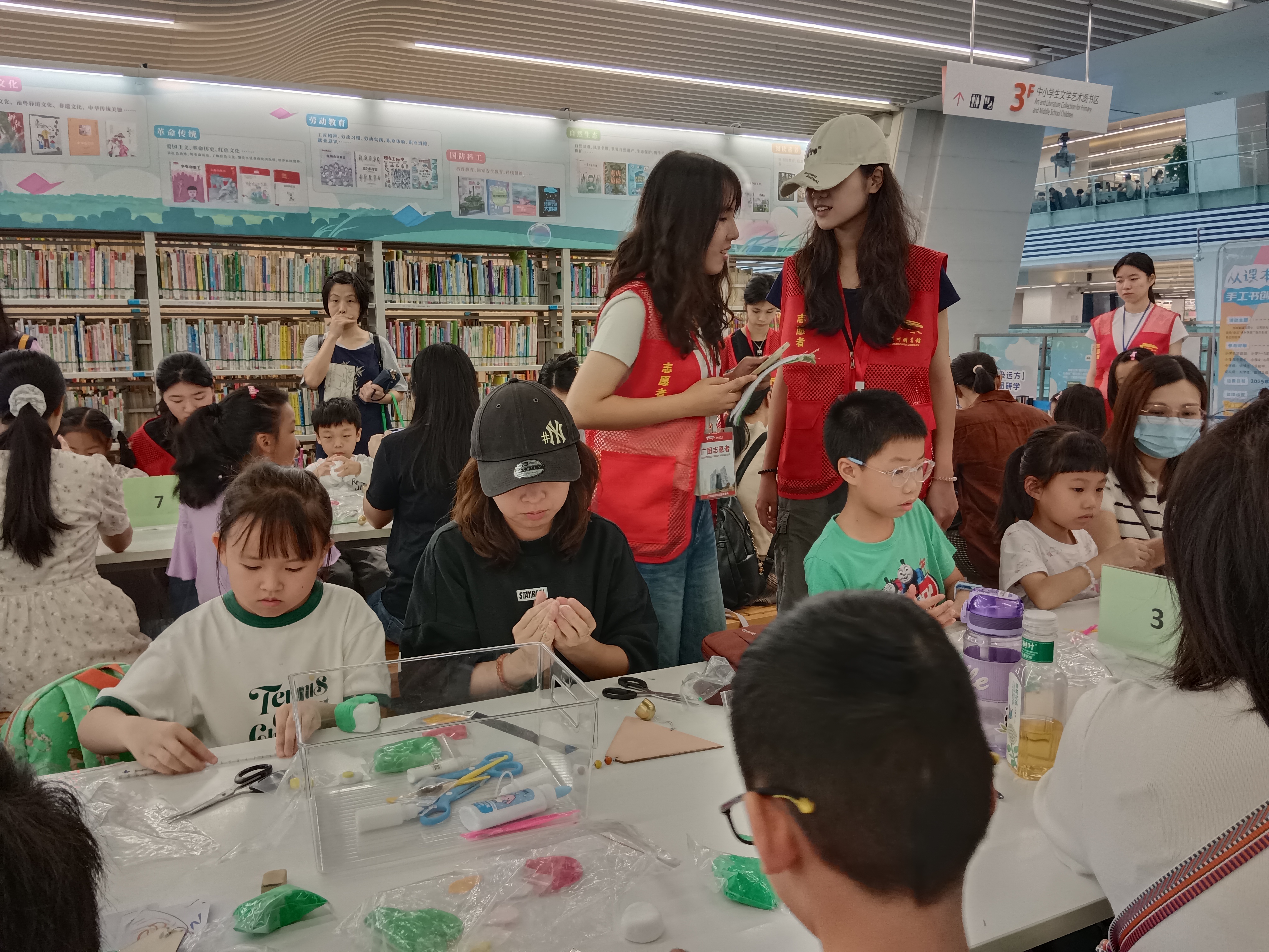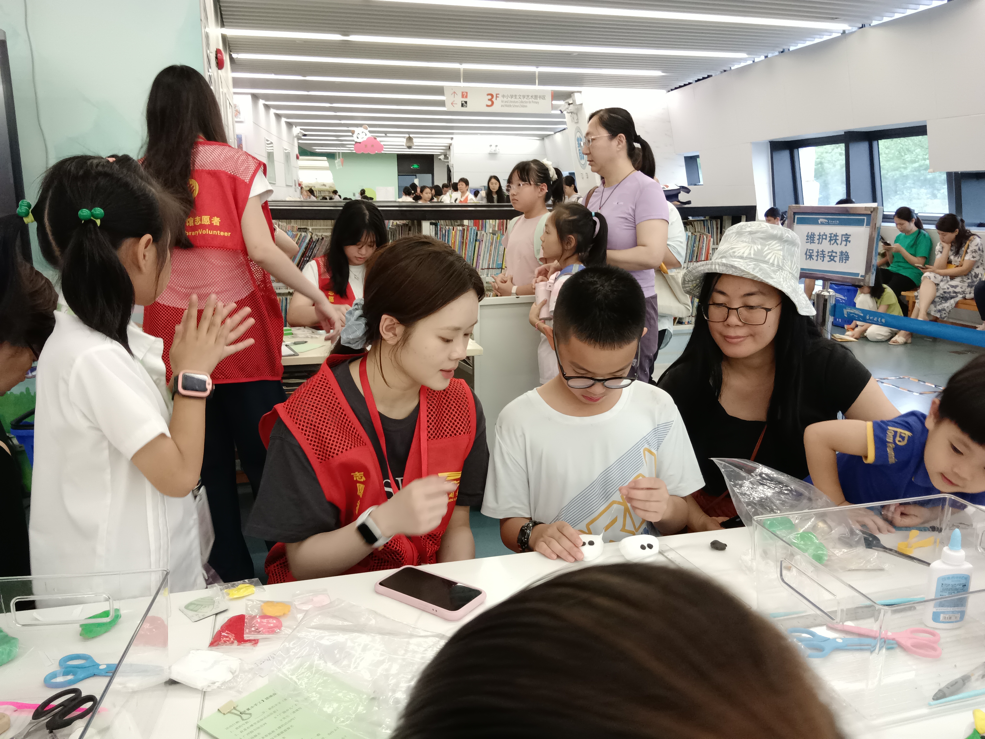 馆员老师和身着红马甲的志愿者热心指导、协助,大屏幕展示着手工相关内容,背景展板透着文化氛围,全天四场手工活动让文化可触摸,让亲子时光有温度。