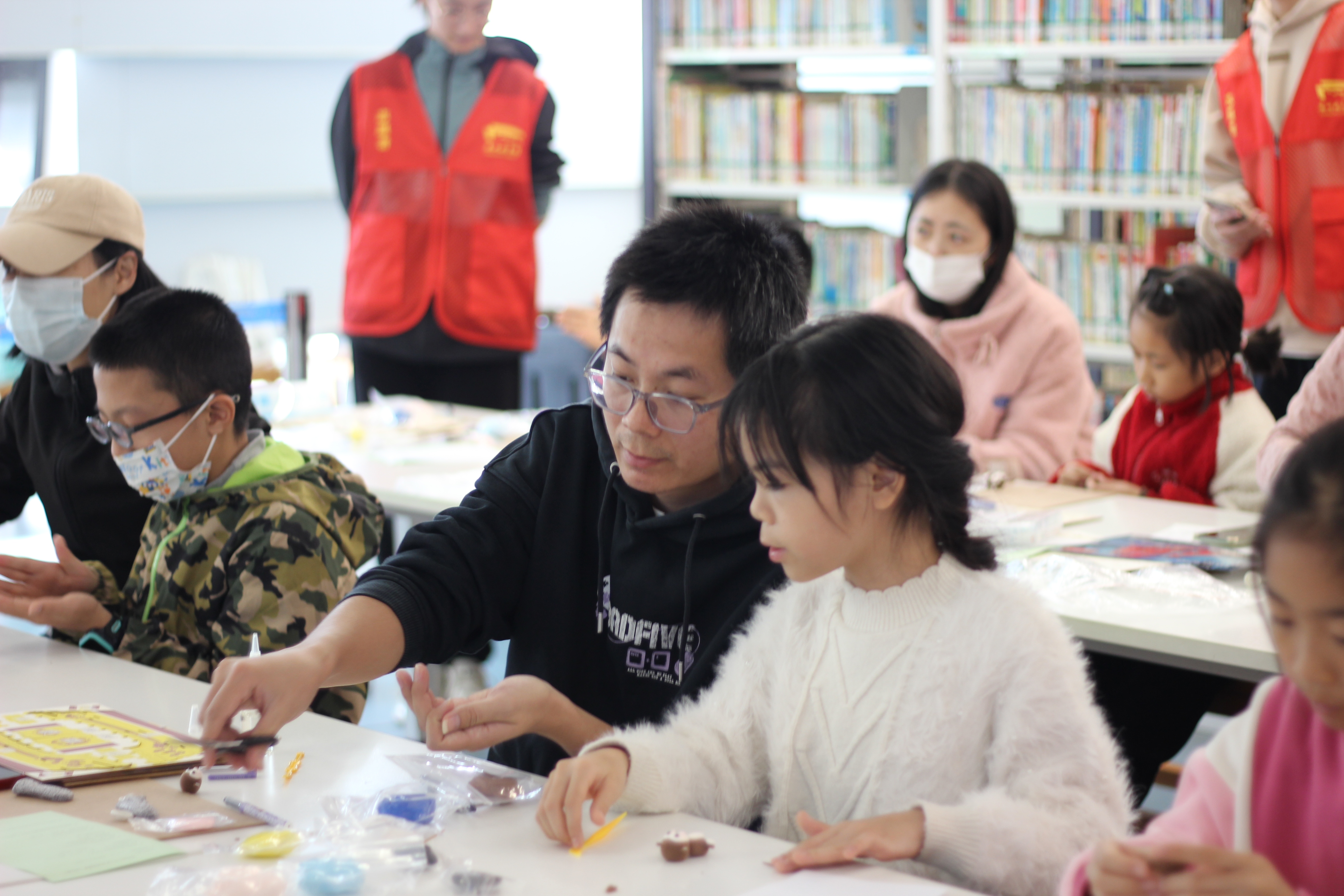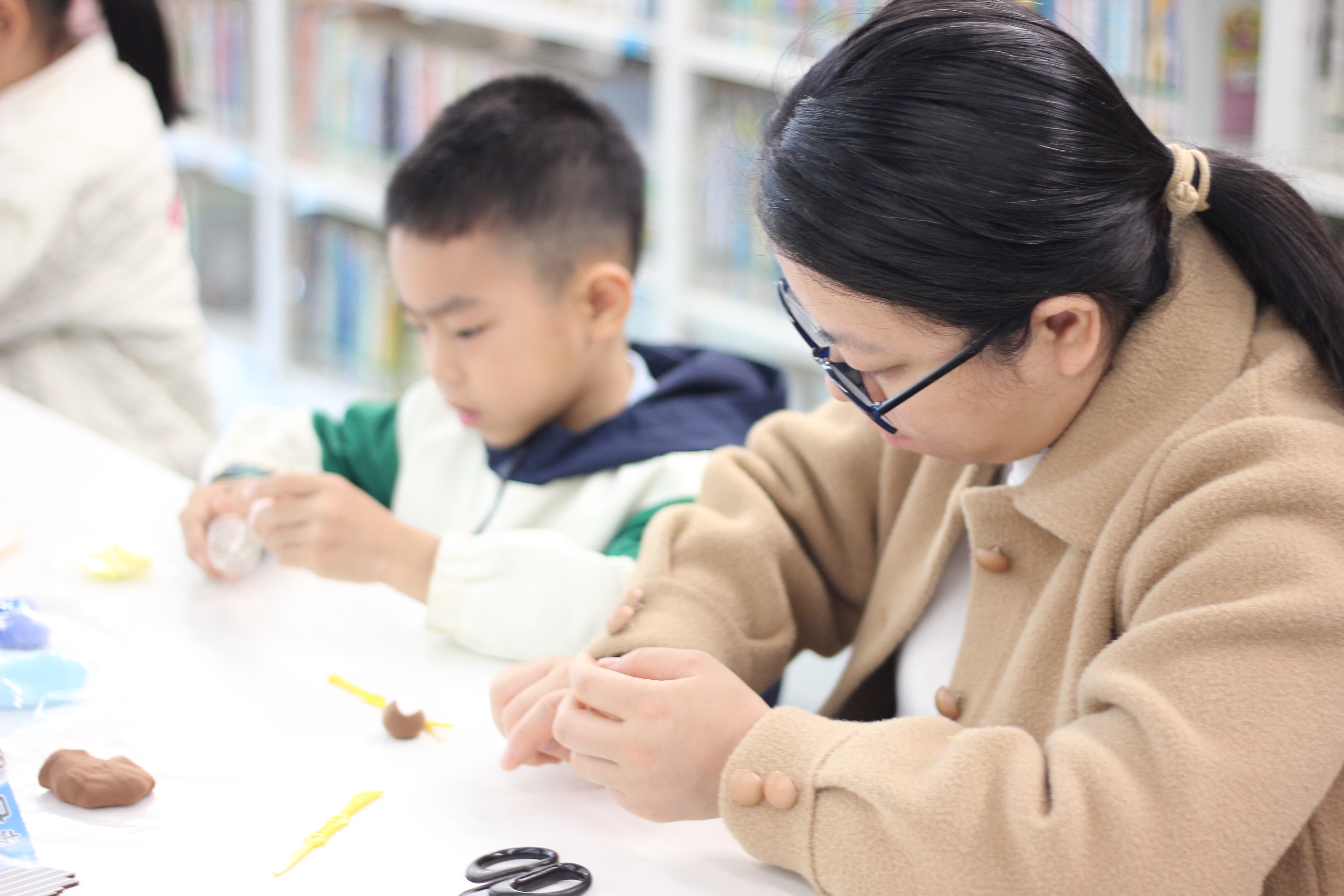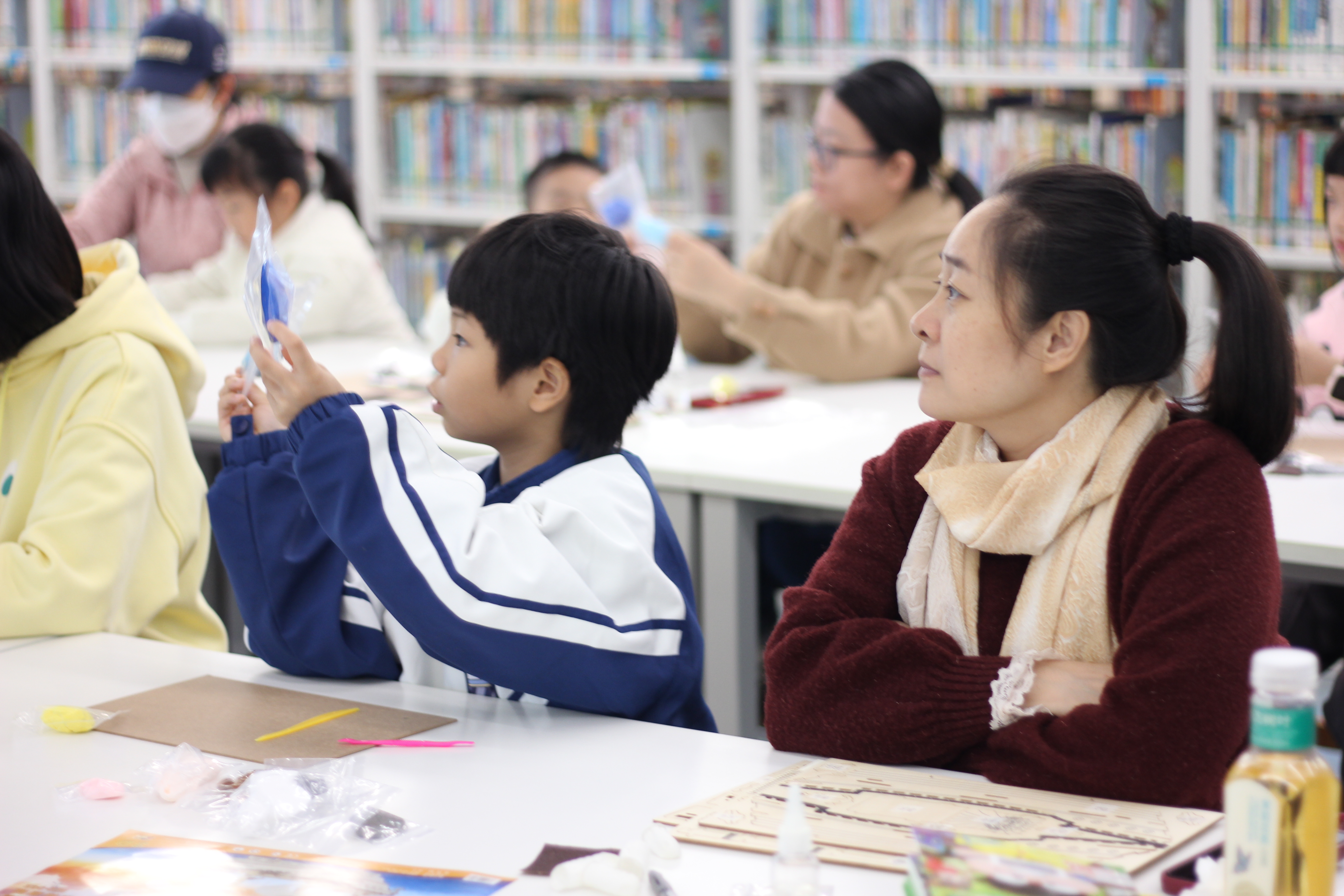 粘土塑形环节,亲子家庭在老师示范下,用彩色粘土塑造故事角色。灵巧的手指捏出圆润的猴脸、俏皮的帽子,以及男孩紧张又倔强的神情。孩子们在塑造中理解人物,家长在旁协助细节,温馨的协作场景随处可见。
